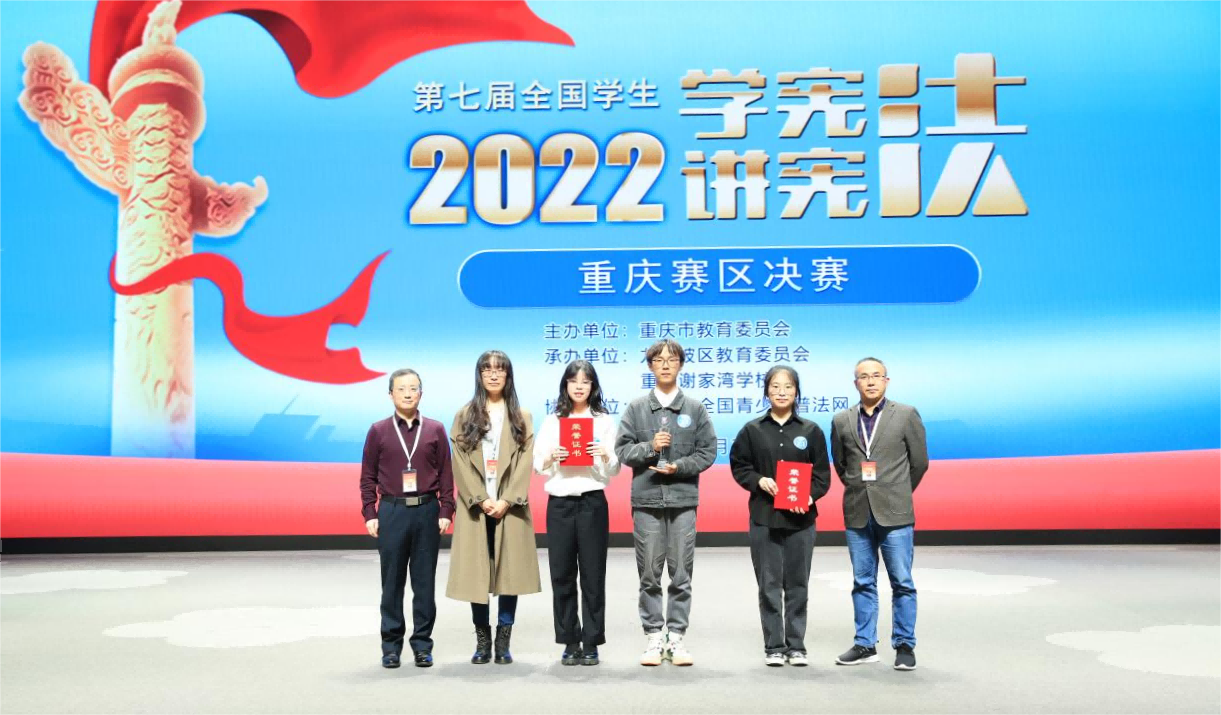 10月30日,第七届全国学生“学宪法 讲宪法”重庆赛区决赛在重庆市谢家湾学校落下帷幕。本次比赛由重庆市教育委员会主办,九龙坡区教育委员会、重庆市谢家湾学校承办,教育部全国青少年普法网协办,分个人演讲赛和知识竞赛两个赛项。法学院本科生2020级曾德尔同学获得知识竞赛高校组(专业类)冠军,将代表重庆参加全国总决赛。