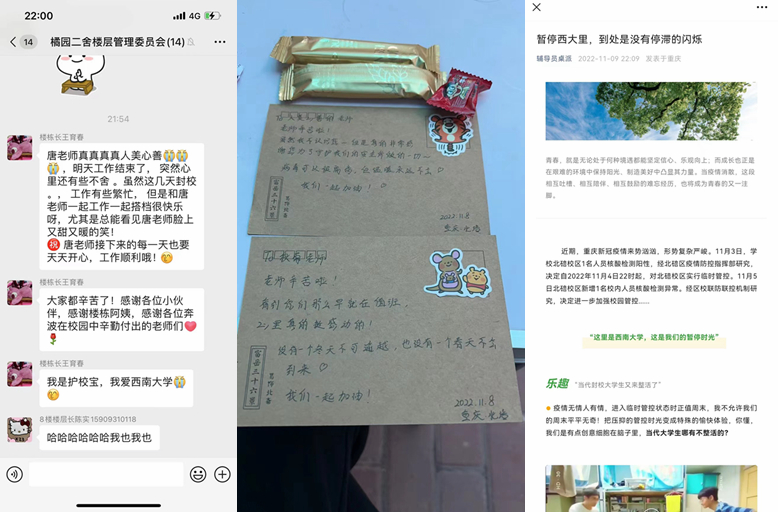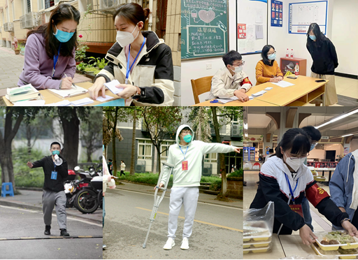 从快从稳,抗疫有速度。学工系统第一时间启动应急预案,激活“两级响应、四层联动”工作机制,形成“片区指挥长、园区负责人、楼栋副书记、楼栋辅导员”和“学生园区自管会、楼栋长、楼层长、寝室长”贯通联动的工作合力。全体学工队伍第一时间闻令而动,近200名学院(部)副书记、辅导员立即入校,下沉园区,全面进驻65栋学生宿舍,确保疫情防控指令迅速落实到位。“我是辅导员,我必须上!”尚在哺乳期的资源环境学院辅导员杨茜克服家庭困难,进校陪伴学生;“守护学生安全是我们义不容辞的责任”,腿伤尚未痊愈的外国语学院辅导员黄亦豪拄着拐杖,依然坚守一线……这就是“新学工”队伍的奋斗群像。