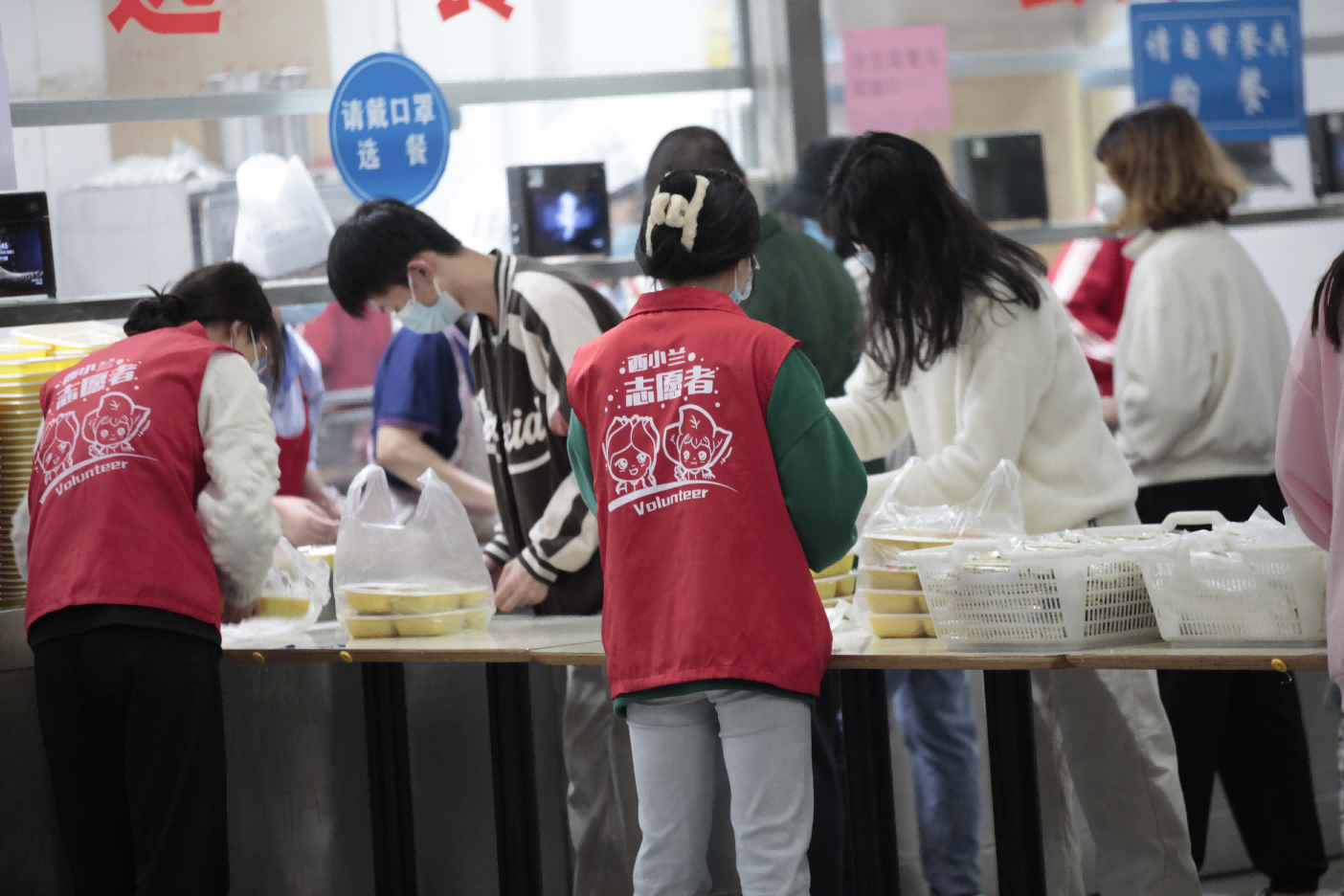 把牢疫情防控秩序线。疫情突发后,学校团委根据工作安排,迅速招募,3小时内得到近千名学生的积极响应。11月4日以来,每天400余名“西小兰”学生志愿者在20个食堂、8个教育超市、4个快递服务站开展秩序维护等工作。从早上7点到晚上7点,他们利用上网课、做核酸以外的时间,在食堂门口进行有序引导、辅助食堂工作人员打包餐食、在快递站维护秩序,2500余名学生志愿者以最饱满的热情、最暖心的服务彰显青年担当。根据工作安排,临时过渡期学校每天约500名学生志愿者在一运、三运、六运提供物资分拣、秩序维护等服务。