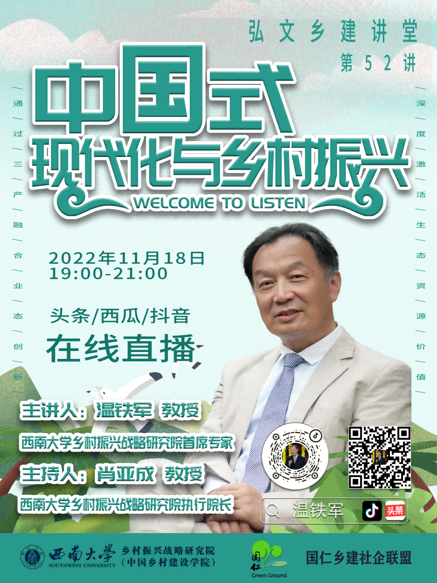 为深入学习贯彻党的二十大精神,推动疫情期间学术研究不断线,11月18日,学校乡村振兴战略研究院组织线上专题讲座,引起社会广泛关注与讨论。讲座以“中国式现代化与乡村振兴新格局”为题,研究院首席专家温铁军教授为主讲人,执行院长肖亚成教授主持讲座。讲座通过今日头条、抖音、西瓜视频三个平台同步直播,当晚吸引了近百万观众在线参加。
