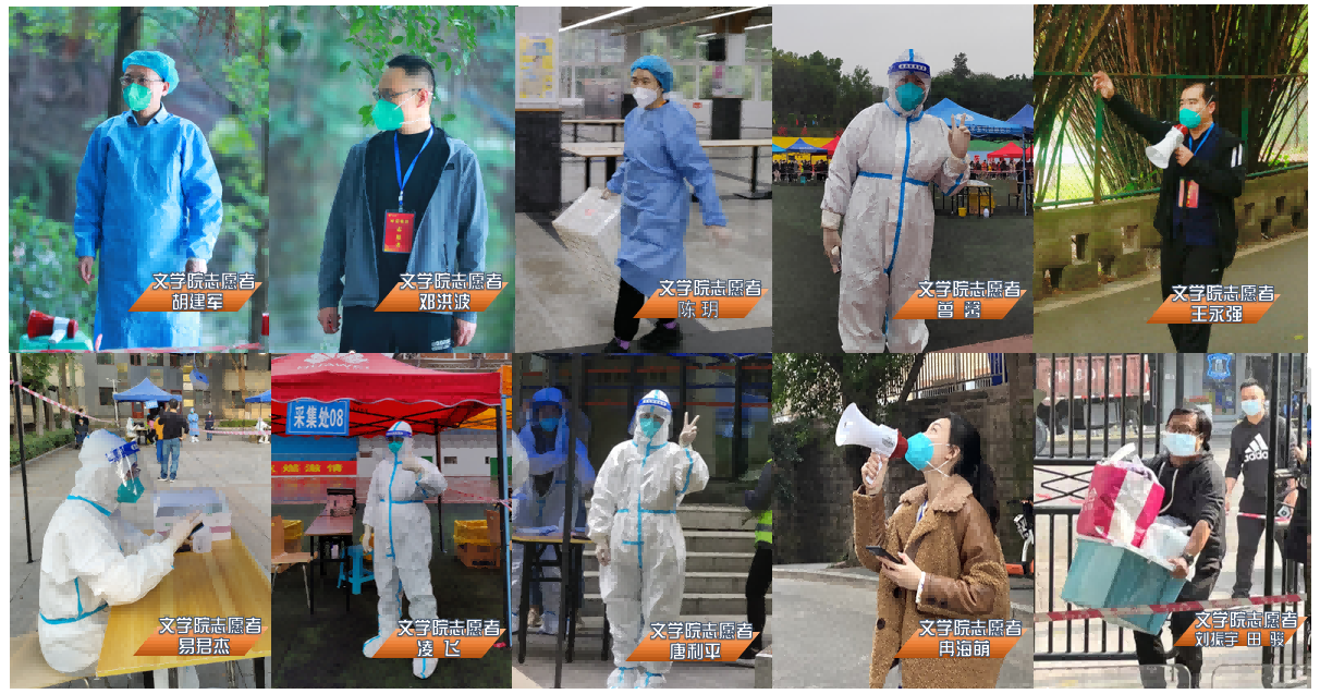 面对疫情的突然来袭,文学院胡建军、邓洪波、陈玥、曾馨、王永强、凌飞、唐利平、冉海萌、易君杰、刘振宇等闻令即行,积极投入疫情防控工作;王本朝、寇鹏程、张春泉等每日电话了解学院疫情防控工作情况,关心师生生活及后勤物资保障需求,积极部署实施线上教学科研等工作。大家统一思想,坚定不移的贯彻执行学校疫情防控工作整体部署及要求,坚守在各自疫情防控“第一线”。白天,他们下沉园区,进驻楼栋,组织学生有序取餐,进行全员核酸检测,做好每日值班值守;夜晚,他们研究部署新的防控任务,动态更新师生信息台账和重点人员台账,督促师生每日健康打卡,将疫情防控工作落实落细。他们舍小家、为大家,从父亲、母亲、丈夫、妻子的角色迅速转换成“天使白”“志愿红”“抗疫蓝”,恪尽职守,担当奉献。