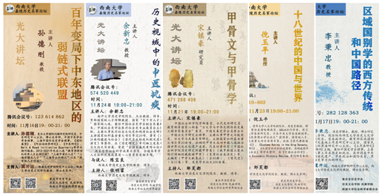 自11月4日以来,学院举办9场大型学术讲座,邀请到中国社会科学院、清华大学、复旦大学、南开大学、四川大学、华东师范大学、陕西师范大学等单位的学部委员、国家级人才及学术名家齐聚杏林、纵论古今。讲座内容涵盖了甲骨文与甲骨学、区域国别学、十八世纪的中国与世界、中医抗疫、中东问题、长城与边防、历史教育等诸多领域,彰显了学院“博雅会通”的治学风貌和立德树人的办学理念。