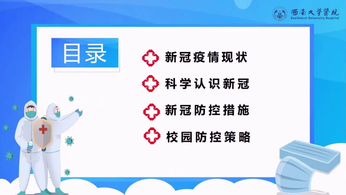 为精准回应学校师生关切问题,推动广大师生同舟共济、守望相助、同心抗疫,学校推出“同心战疫”系列讲座,用好战疫“活教材”,打好抗疫“保卫战”。校医院党委书记、院长吴宗辉11月26日受邀为全校师生带来《如何做好校园新冠疫情防控》线上专题讲座。