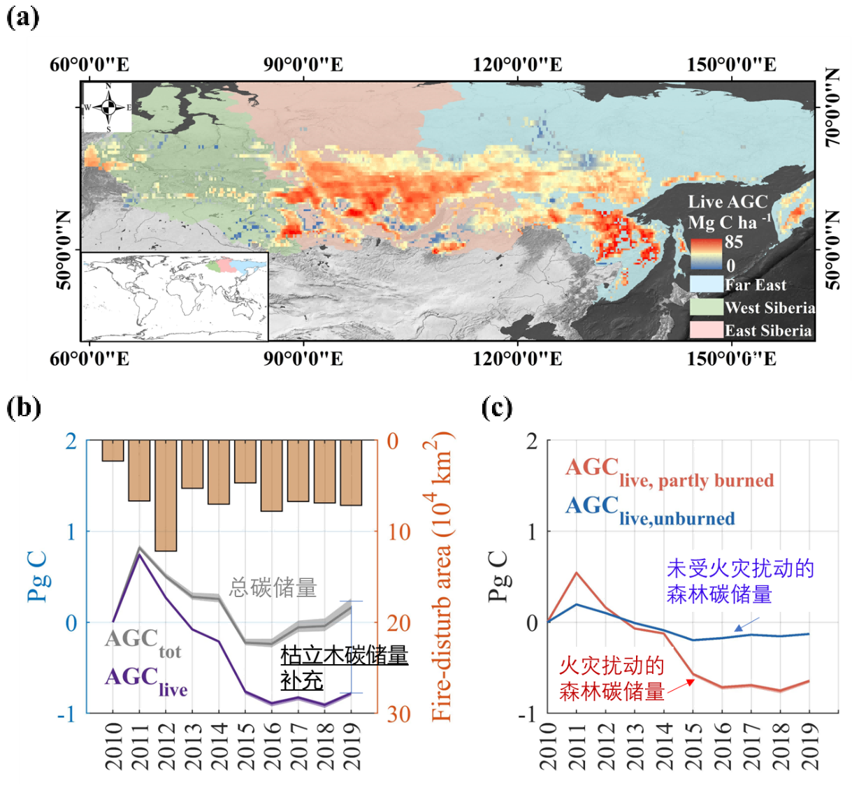 北方森林是全球陆地生态系统中最重要的碳汇。但是,近十年来在气候变暖的大背景下,北方森林高温、干旱、火灾事件频发,对其碳汇能力产生严重影响。针对北方森林是否已从碳汇扭转为碳源这一科学问题,基于(自主研发的)低频被动微波反演的地上森林碳储量产品,团队创新性的构建了西伯利亚地区枯立木碳储量估算模型,厘清了西伯利亚地区北方森林地上总碳量的时空变化格局(图1a),揭示了西伯利亚森林在2010-2019年期间仍呈弱碳汇的能力(0.02 Pg C yr-1)(图1b),发现持续干旱和火灾是导致西伯利亚地区森林碳储量持续下降的主要原因(图1c)。该系列成果强调了在全球变暖的背景下,加强政府间合作,终止森林砍伐、开展可持续管理森林、恢复退化森林的紧迫性。