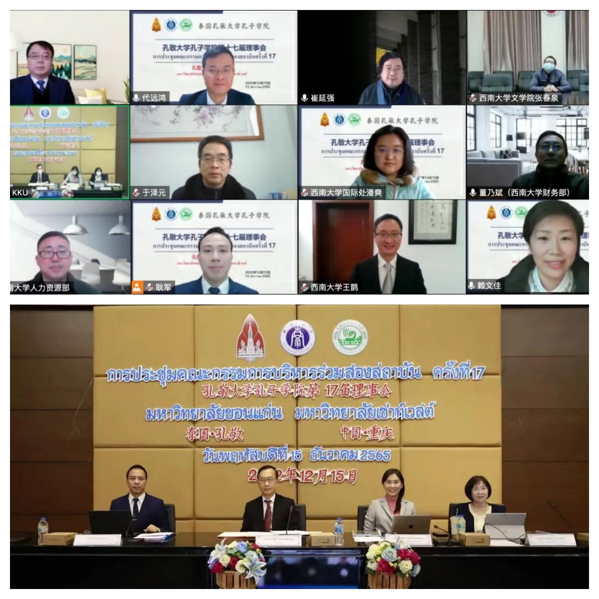 12月15日,学校合作共建泰国孔敬大学孔子学院第十七届理事会在重庆和孔敬两地在线同步召开。孔敬大学校长常才、beat365英国官网副校长崔延强出席会议并致辞,孔敬大学校长助理阿查拉婉、教育学院院长苏玛丽,孔子学院泰方院长陈海楠、中方院长耿军等理事会成员,学校人力资源部、国际合作与交流处、财务部、文学院、国际学院等相关单位负责人参会。