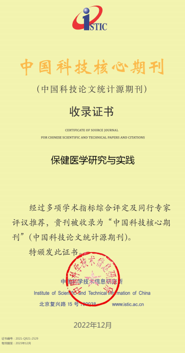 12月29日,《保健医学研究与实践》成功入选“中国科技核心期刊(中国科技论文统计源期刊)”。该杂志由教育部主管、学校主办、校医院承办,是国内外公开发行的综合医学类学术期刊,是中华预防医学会系列杂志、中国高校医学系列期刊。
