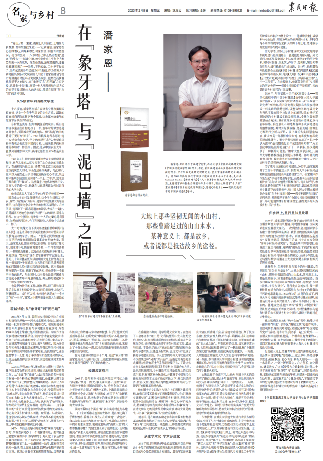 2月8日,农民日报以《潘家恩——在“象牙塔”与“泥巴墙”之间》为题,整版报道学校潘家恩教授带领师生参与乡村振兴有关事迹。报道原文如下:
