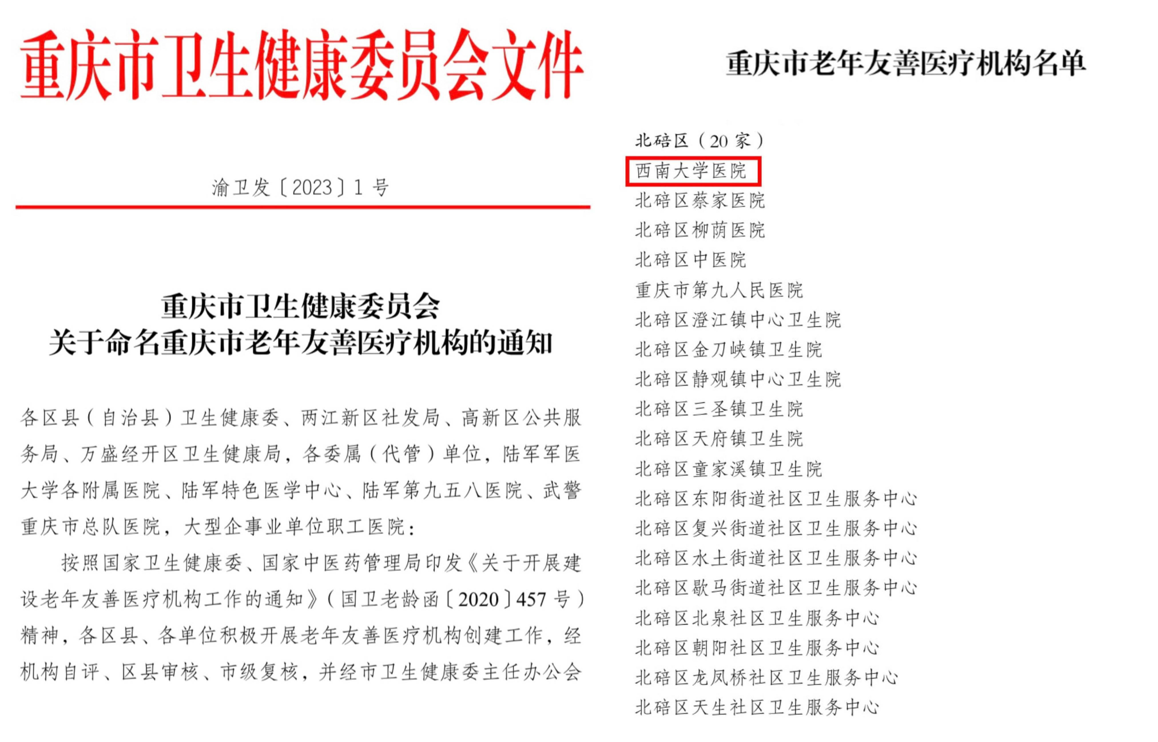 近日,重庆市卫生健康委员会命名全市946家医疗机构为“重庆市老年友善医疗机构”。其中,北碚区20家医疗机构上榜。beat365英国官网医院是北碚区唯一创建成功的二级公立医院,同时也是重庆市高校医院中唯一获评医院。