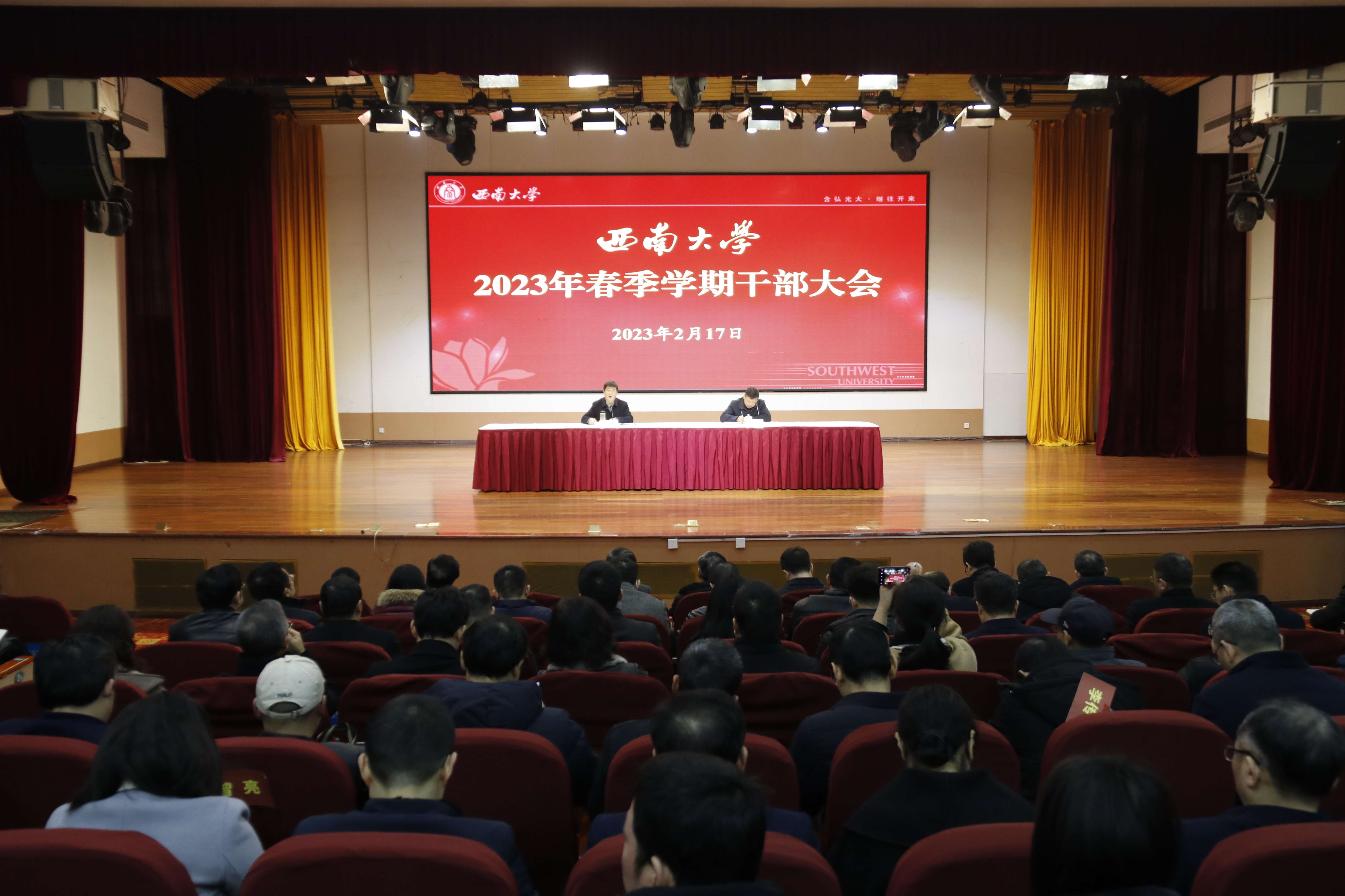 2月17日上午,学校召开2023年春季学期干部大会,安排部署2023年主要工作。全体校领导、党委委员、纪委委员,机关部门、直附属单位、企业单位主要负责人,副处级以上领导干部,民主党派基层组织和统战团体主要负责人,教代会执委会委员,有关科研机构负责人参加会议。会议由学校党委书记李旭锋主持。