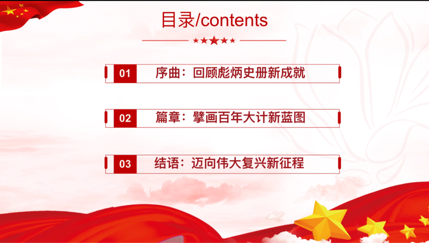 宣讲活动以“序曲”“篇章”“结语”三部分展开,“序曲”部分以“回顾彪炳史册新成就”为主题,带领师生回顾了新时代十年的伟大变革和辉煌成就。“篇章”部分以“擎画百年大计新蓝图”为主题,向大家展示了国家实现民族复兴的宏伟蓝图以及中国特色社会主义思想的强大生命力。“结语”部分以“迈向伟大复兴新征程”为主题,宣讲团成员用坚定的口号“Unity is strength ,and only in unity can we succeed”来续写华丽篇章,以顽强的信念“A nation will prosper only when its young people thrive”来展现青春担当。