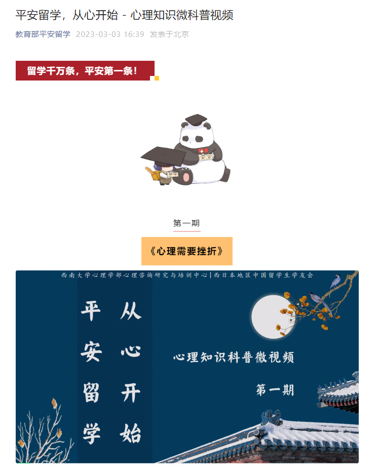 近日,由学校心理学部心理咨询研究与培训中心组织制作的系列心理微视频在教育部官方微信平台陆续发布。