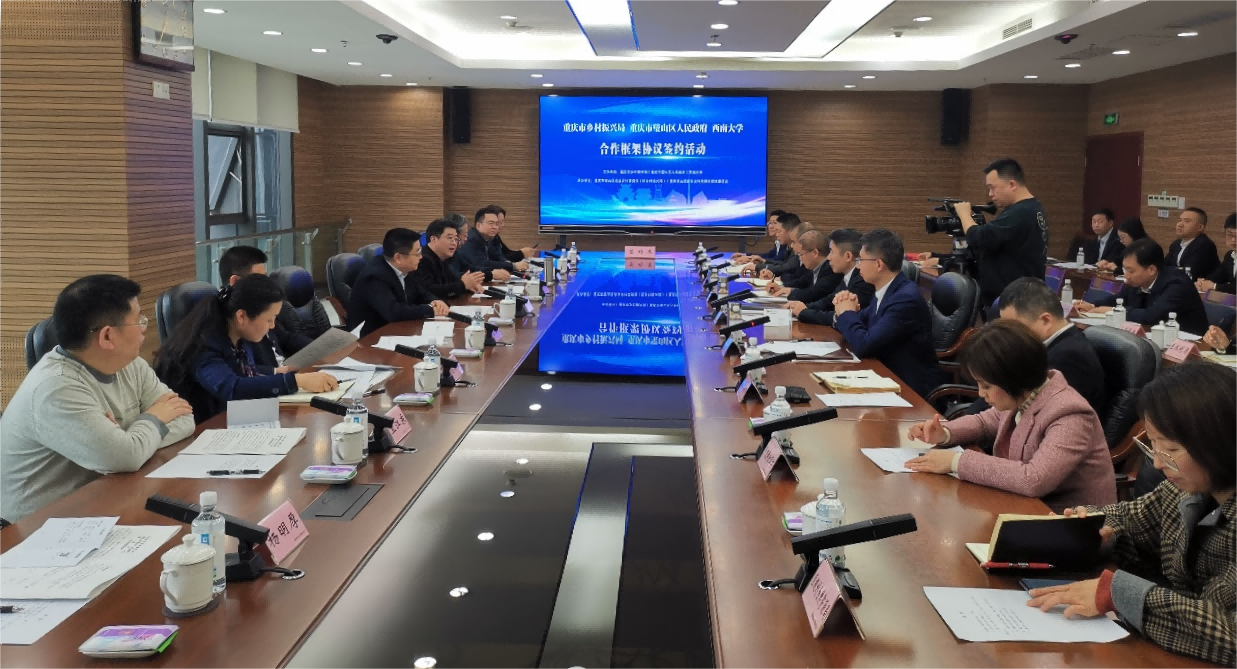 签约活动上,安春元代表学校与重庆市乡村振兴局、璧山区人民政府签署推进乡村振兴创新示范三方合作协议,学校精准扶贫与区域发展评估研究中心主任廖和平教授与璧山国家农业科技园区签订专家工作室共建合作协议。