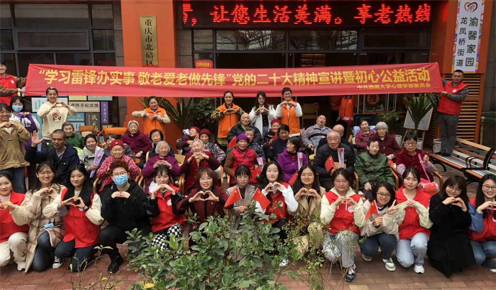 为推动党的二十大精神深入基层、深入群众,贯彻落实习近平总书记对深入开展学习雷锋活动作出的重要指示精神,2023年3月19日上午,心理学部党委组织学生赴北碚区龙凤桥街道社区养老服务中心,开展“学习雷锋办实事 敬老爱老做先锋”党的二十大精神宣讲暨葆初心公益活动。心理学部教师熊丹带领“心+”红色空间站及各党支部学生党员、入党积极分子共二十余人,现场开展党的二十大精神微党课、老年人心理健康知识小讲堂和敬老爱老学雷锋志愿服务。活动由“心+”红色空间站成员陈子夷主持。