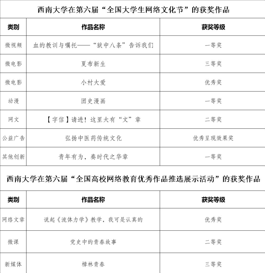 近日,由教育部、中央网信办主办,全国高校网络文化及思政领域最高级别竞赛之一的第六届“全国大学生网络文化节”和“全国高校网络教育优秀作品推选展示活动”获奖结果揭晓。在本次大赛中,学校师生的10件作品从全国各高校的35225件作品中脱颖而出,斩获一等奖3项,二等奖2项,三等奖2项,优秀奖2项,优秀呈现效果奖1项。其中获奖总数、一等奖总数均位居重庆市高校第一,更是全国唯一一所高校同时在微视频、动漫、其他创新三类别均获一等奖。