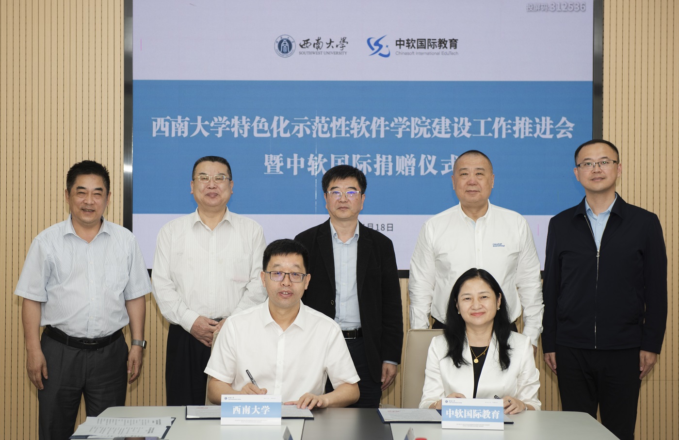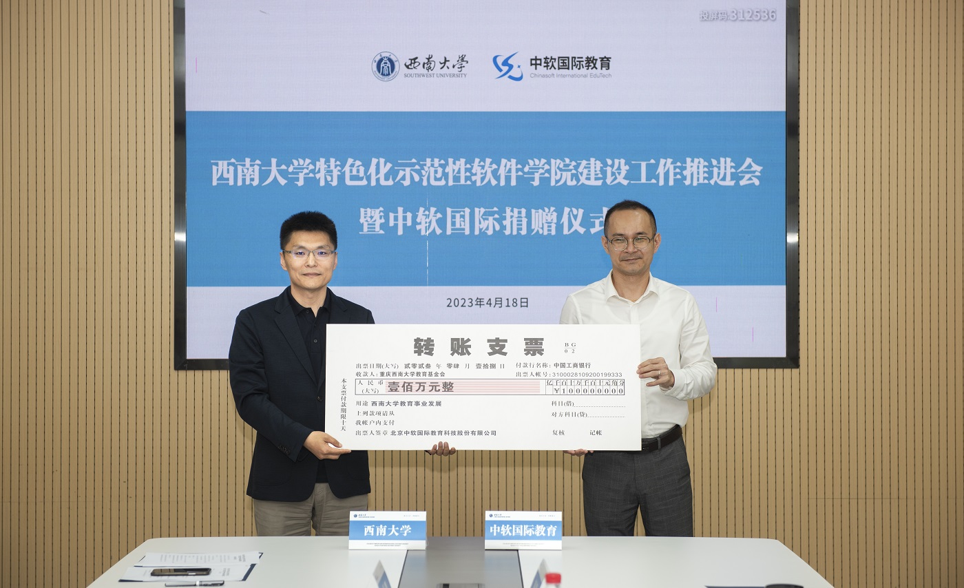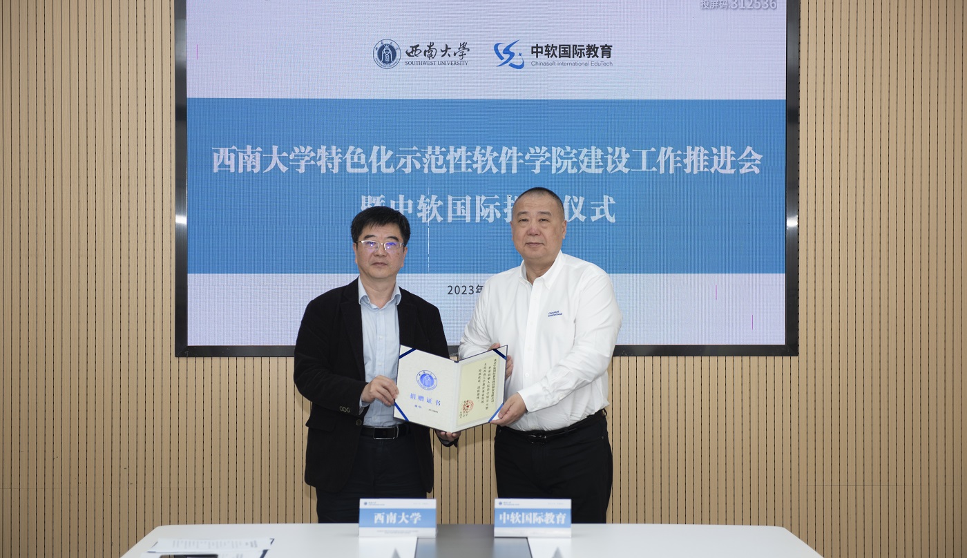 本次会议上,中软国际教育向学校捐赠100万元人民币,学校党委书记李旭锋向中软国际教育颁发荣誉证书,学校副校长赵国华、中软国际教育科技集团副总裁成焕代表双方签订捐赠协议。