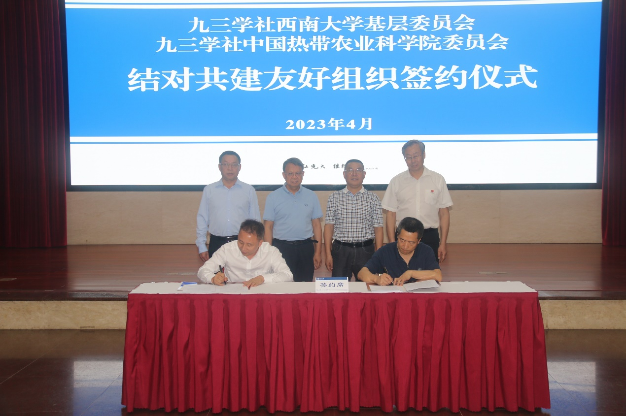 在结对共建协议签约仪式上,学校党委副书记安春元致辞,安春元介绍了学校统战工作和九三学社基层委员会基本情况,对校地双方开展的民主党派合作交流表示支持,并祝愿结对共建活动取得丰硕成果。九三学社海南省儋州市基层委员会与九三学社重庆市北碚区委员会、九三学社中国热带农业科学院委员会与九三学社beat365英国官网基层委员会分别签订结对共建友好组织战略合作协议。杨锋、周耀柒、黄华分别讲话。