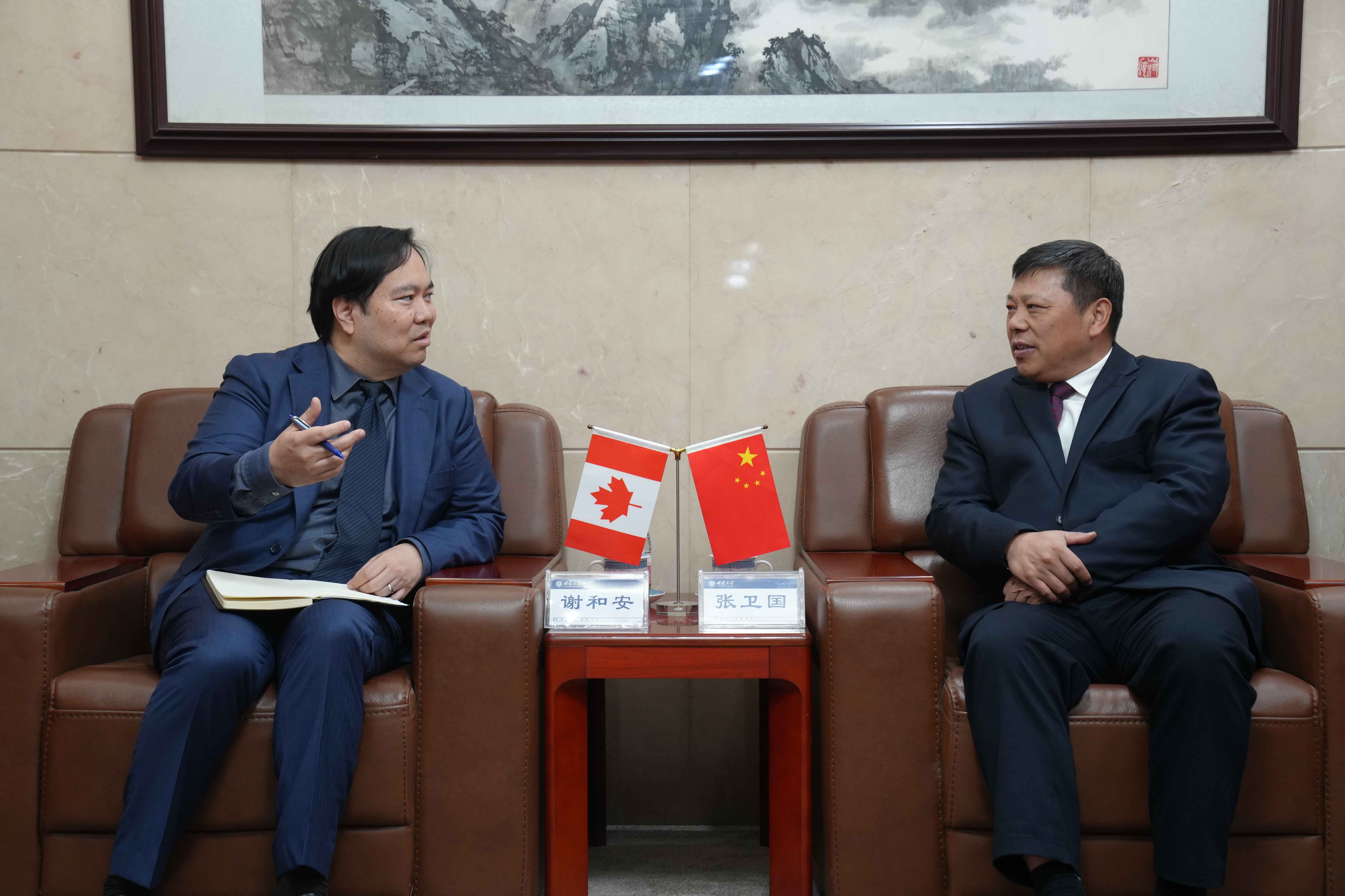 仪式前,张卫国会见谢和安一行,双方就加强beat365英国官网与加拿大高校合作、增进中加两国人文交流展开深入探讨。