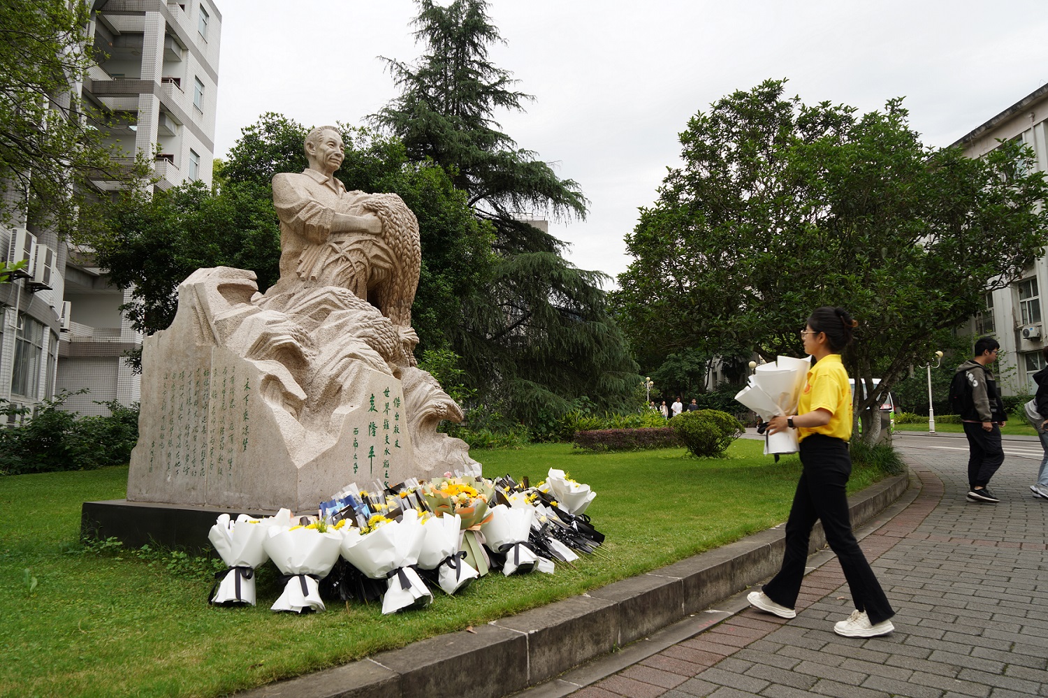 一生躬耕田间,换得稻香丰年的袁隆平院士是“共和国勋章”获得者,是“杂交水稻之父”,是让中国人“端牢饭碗”的英雄,在beat365英国官网学子心中,他更是大家的好学长、好老师。5月22日清晨,众多师生自发来到袁隆平院士雕塑前寄托哀思、敬献鲜花、汇报学业。他们当中,有美术学院、文学院的学生带来了为隆平学长所作的画像、题写的书法作品,有农学与生物科技学院“袁隆平奖学金”获得者前来敬献鲜花,还有资源环境学院学生手捧培育的沃土来表达追思……袁隆平院士勇于创新、无私奉献的精神永驻beat365英国官网师生心间。