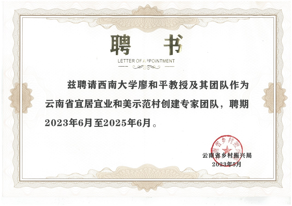 座谈交流后,云南省乡村振兴局为廖和平教授团队颁发了“云南省宜居宜业和美示范村创建专家团队”聘书,聘期为2023年6月至2025年6月。参加此次座谈会的还有中国农业大学李小云教授团队。