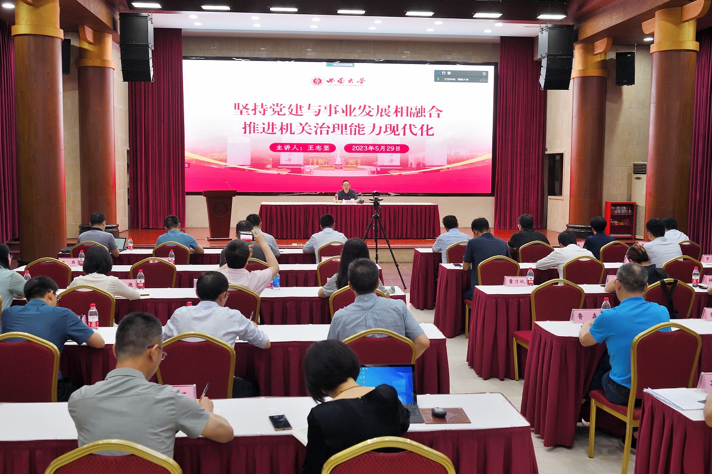 为扎实推进学习贯彻习近平新时代中国特色社会主义思想主题教育,5月29日上午,副校长、机关党委书记王志坚为机关党委全体党员讲授题为《坚持党建与事业发展相融合 推进机关治理能力现代化》的专题党课。机关党委委员、纪委委员、机关党委全体党支部书记及机关各单位主要负责同志在东方红主会场参加学习,机关党委400余名党员同志在本单位会议室通过线上方式学习。