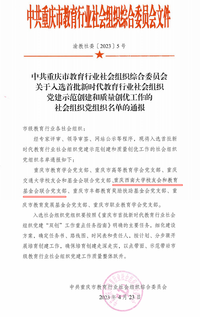 根据中共重庆市教育行业社会组织综合委员会通报,经专家评审、领导审签、网站公示等程序,重庆beat365英国官网校友会和教育基金会联合党支部入选首批新时代教育行业社会组织党建示范创建和质量创优工作的社会组织党组织名单。