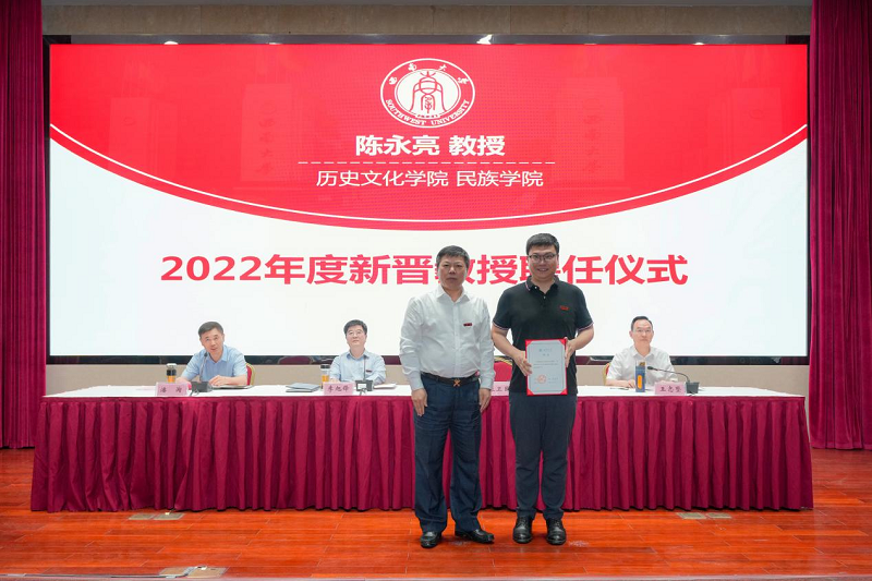 王志坚宣读2022年度新晋教授任职文件。张卫国逐一为新晋教授颁发聘书,并合影留念。