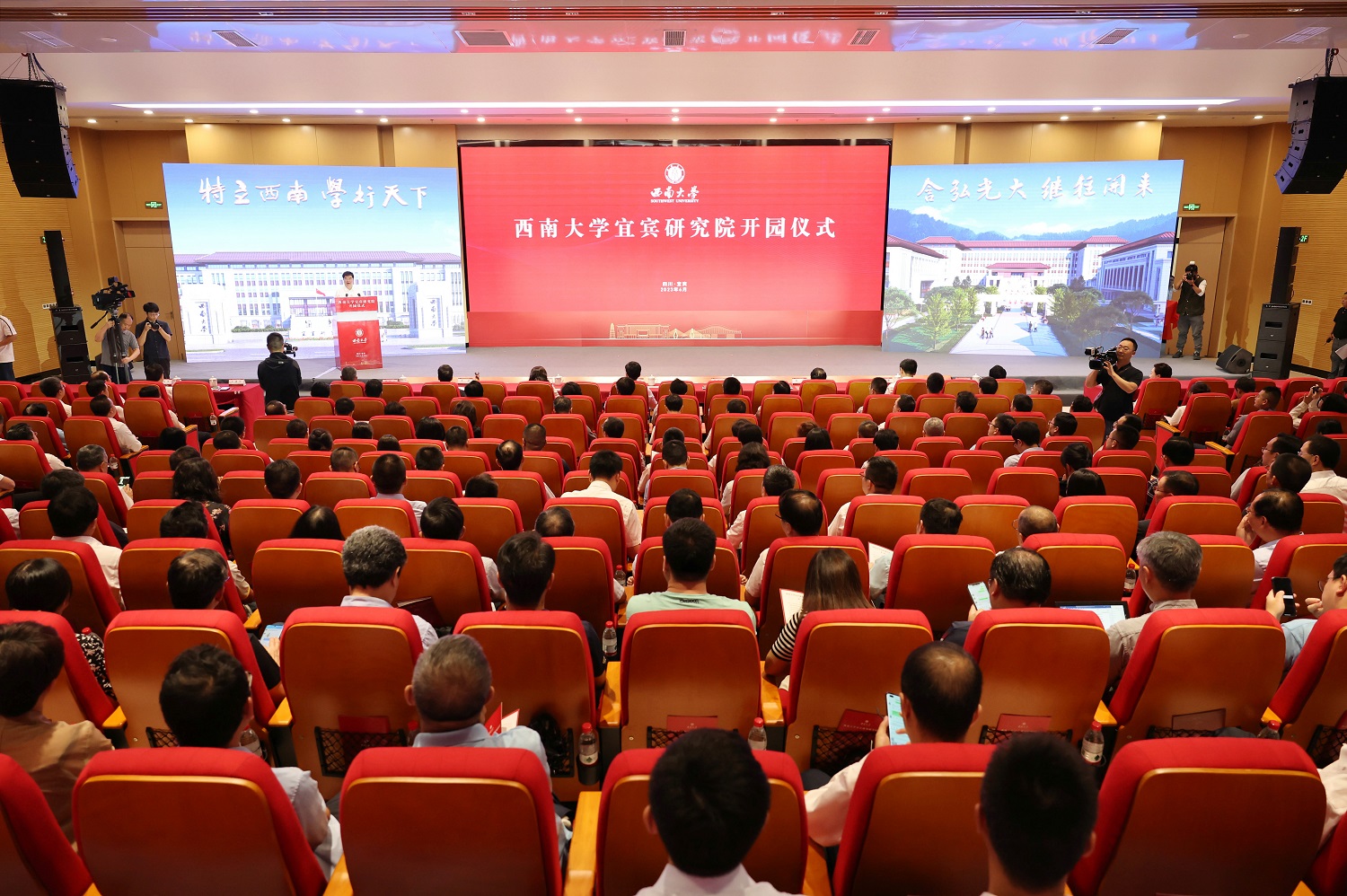 宜宾市领导李静、邓前卫、华淑蕊,五粮液集团党委书记、董事长曾从钦参加推动成渝地区双城经济圈建设教育协同发展联席会议第五次会议,川渝两地教育行政部门、兄弟院校,研究院建设领导小组成员单位,宜宾市和学校有关部门主要领导,友好合作企业事业单位负责人以及各位校友代表、研究生代表等共计300余人参加开园仪式。