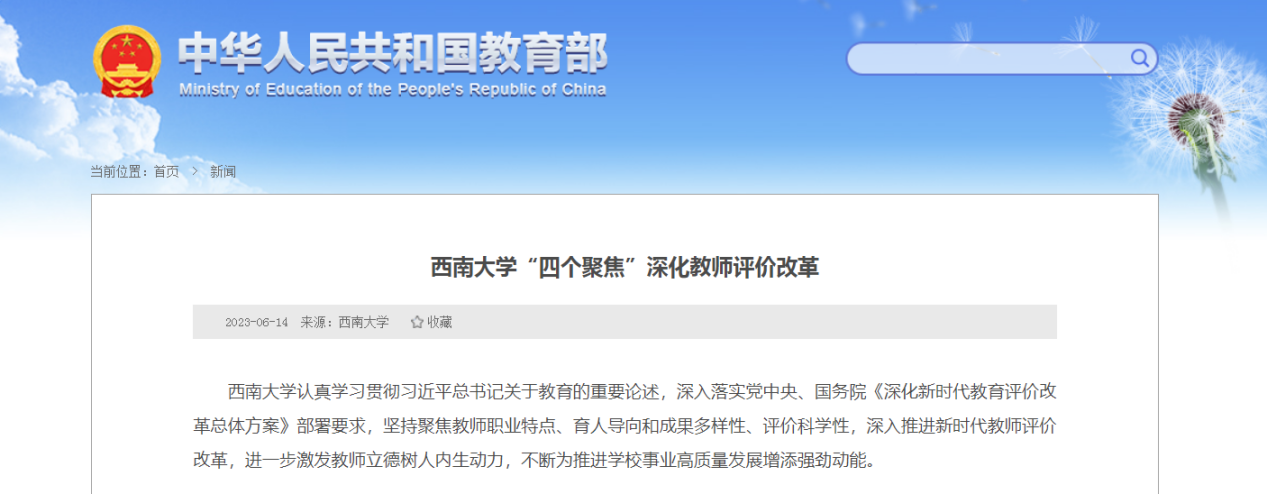 近日,学校“四个聚焦”深化教师评价改革工作受到教育部网站“一线采风”栏目报道,相关内容由党政办公室、发展规划与学科建设部和人力资源部报送。教育部网站报道原文如下: