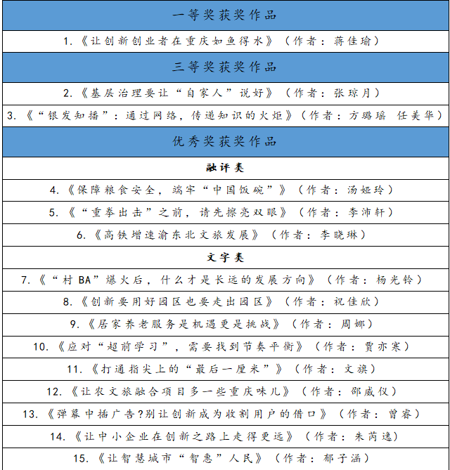 学生蒋佳瑜的文字类作品《让创新创业者在重庆如鱼得水》荣获一等奖。该作品基于“渝论·青年说”第四次线下调研活动“争当创新驱动排头兵”的主题,以沙坪坝区的科技创新发展为评论核心,从盘活存量、做好融合、做好服务三个方面体现推动创新资源加快转化变现的关键。
