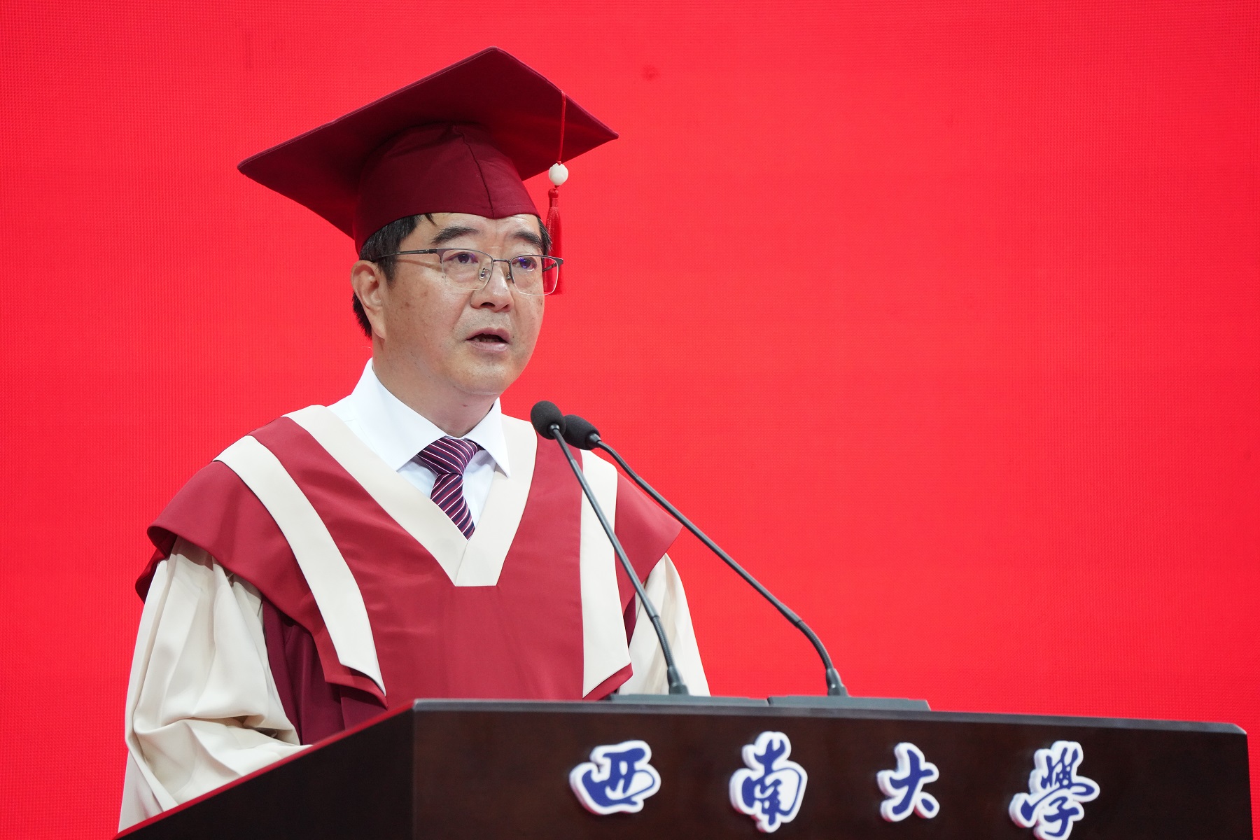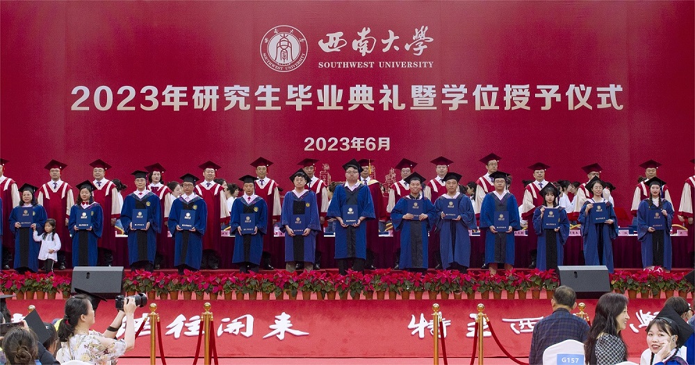 典礼在庄严的国歌声中拉开帷幕。党委书记李旭锋代表学校宣读研究生毕业、授位和表彰决定。根据学校有关学籍管理规定,经学校审核、研究决定:准予154名博士研究生、5064名硕士研究生、24名来华留学博士研究生、29名来华留学硕士研究生毕业。根据重庆市和学校有关表彰办法,经评审,90名研究生被评为“重庆市普通高校优秀毕业研究生”,648名研究生被评为“beat365英国官网2023年优秀毕业研究生”,12名来华留学研究生被评为“beat365英国官网2023年优秀来华留学毕业研究生”,199名研究生撰写的学位论文被评为2023年校级优秀学位论文。经学校学位评定委员会全体委员会议审核,决定授予159名研究生博士学位;授予5072名研究生硕士学位;授予17名来华留学研究生博士学位;授予29名来华留学研究生硕士学位。