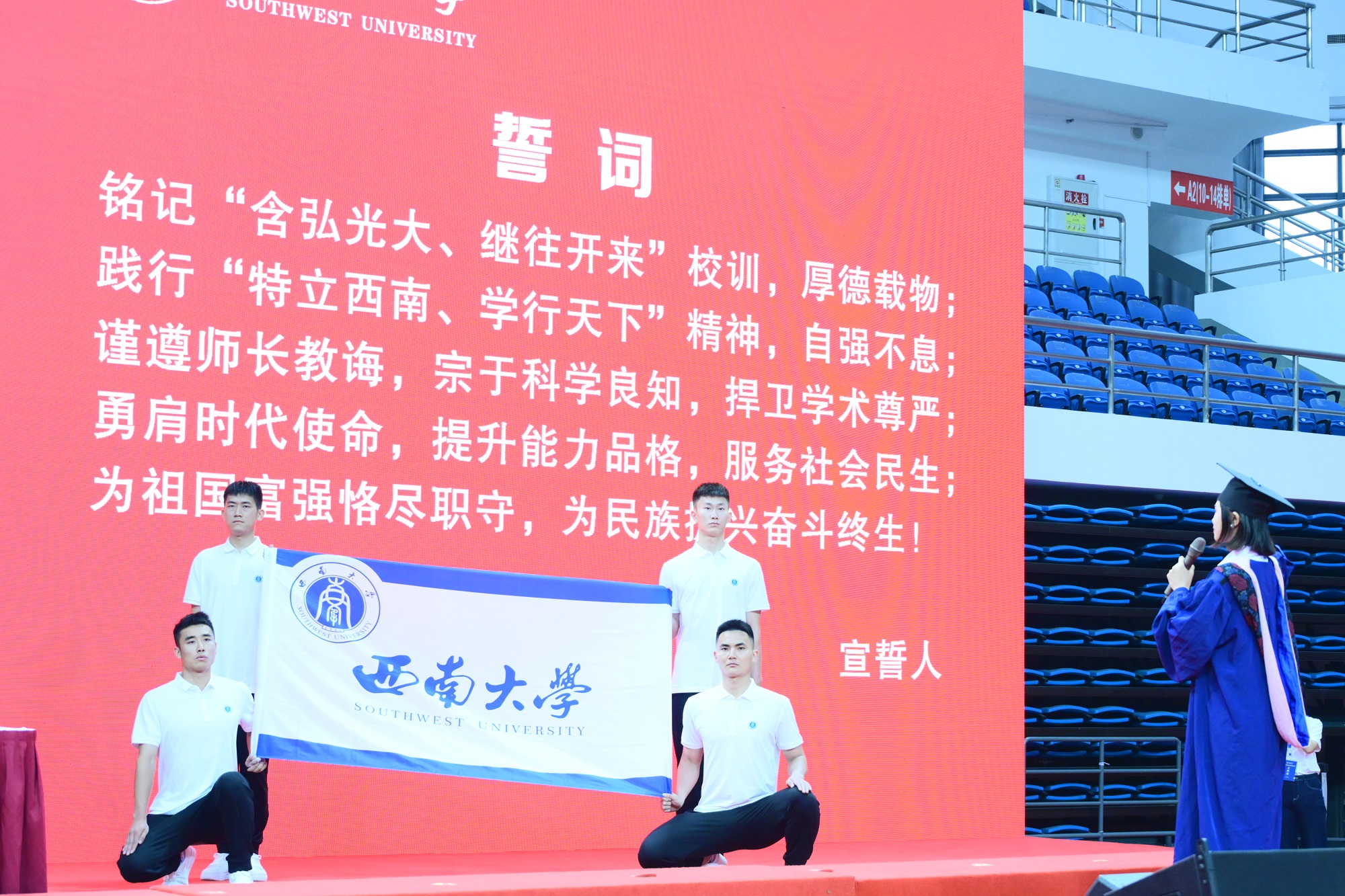 在授位宣誓环节,重庆市优秀学生干部、经济管理学院硕士研究生戴孟月同学领誓,全体毕业生面向beat365英国官网校旗立下铮铮誓言。
