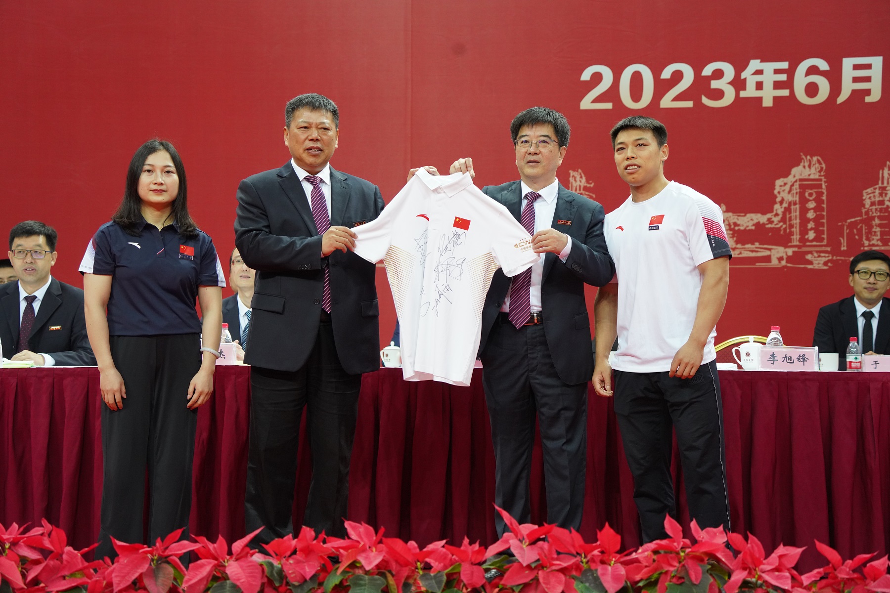 毕业研究生代表,世界冠军谌利军、廖秋云向学校赠送由多名奥运冠军签名的纪念T恤,表达了对学校的美好祝福。