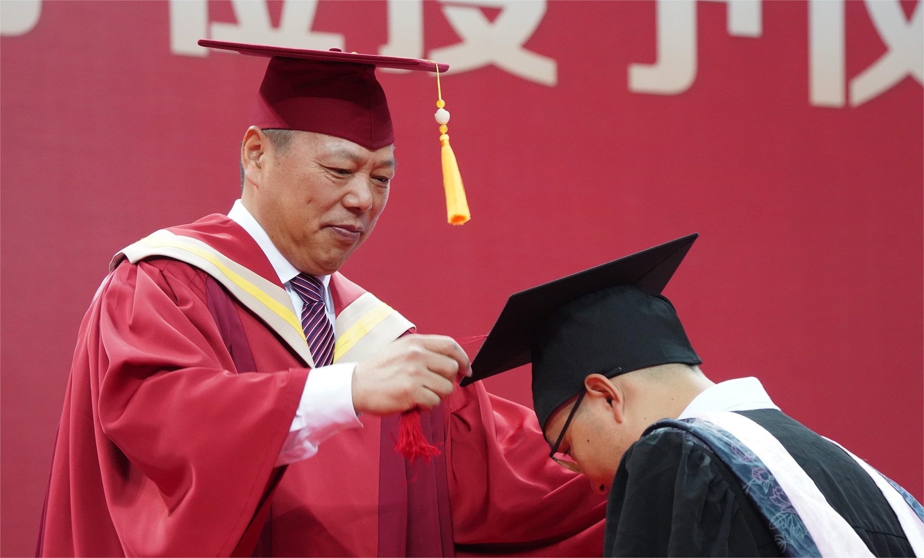 全体校领导、党委常委,校学位评定委员会委员,学生工作领导小组成员单位主要负责人,校友代表,各研究生培养单位负责人、毕业研究生指导教师、辅导员、教学秘书、毕业研究生亲属,2023年全体毕业研究生在现场见证了“拨穗正冠”的荣耀时刻。典礼暨学位授予仪式由副校长、校学位评定委员会副主席王进军主持。