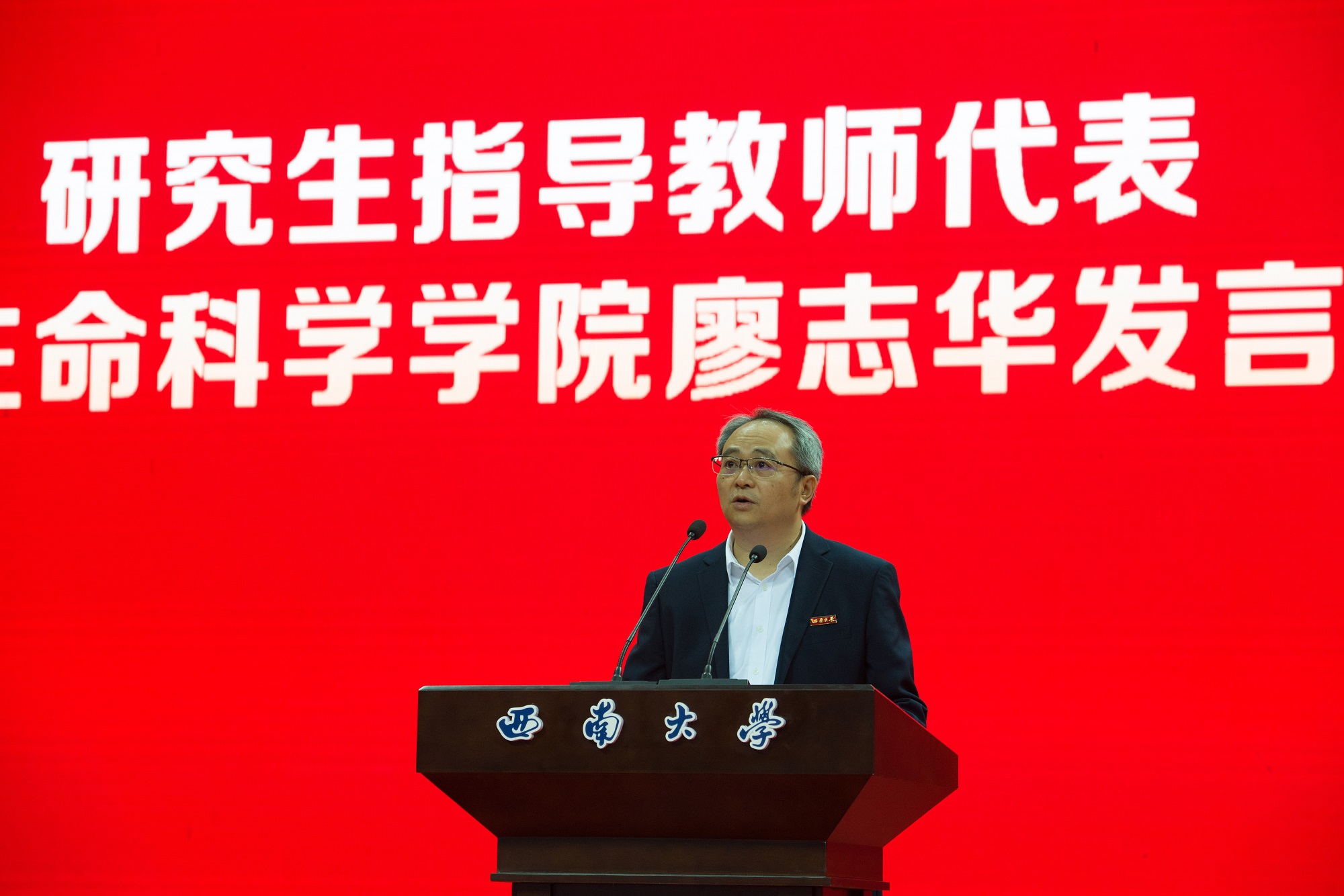 研究生指导教师代表、生命科学学院廖志华教授勉励同学们直面挫折、心存善良、志存高远,不断学习和更新自己的知识和技能,勇于探索新领域、新技术、新思维,怀揣超越自我的渴望,秉持积极创新与变革的信念,努力成为勇往直前的先行者和引领者。