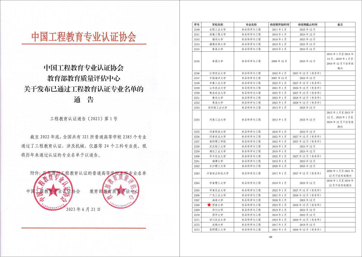 近日,从中国工程教育专业认证协会和教育部高等教育教学评估中心获悉,学校食品科学学院食品科学与工程专业顺利完成了工程教育专业认证申请审核、自评审核、专家组现场考察、结论审议等程序,依据《工程教育认证工作规范》(T/CEEAA 002—2022),通过了工程教育认证。此外,学院食品质量与安全专业也已通过工程教育认证申请审核和自评审核环节,正积极筹备迎接专家组现场考察。