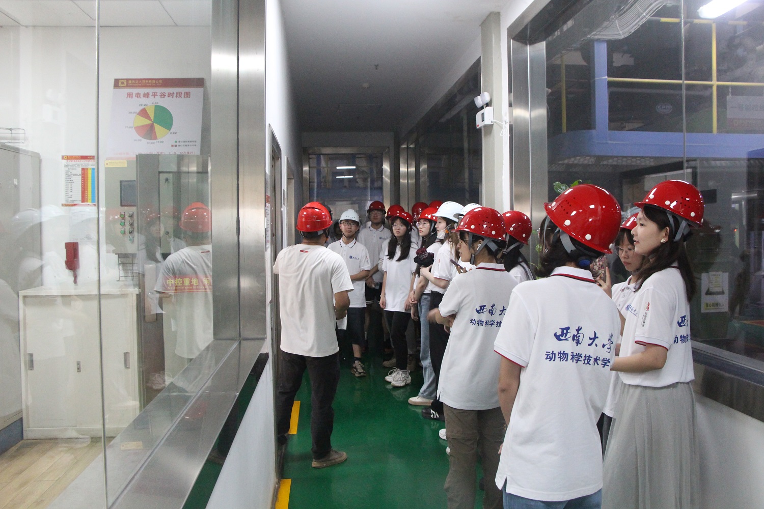 7月1日,社会实践小分队到达位于重庆市涪陵区的重庆正大饲料厂参观调研。在企业负责人带领下,成员们进入饲料生产车间入料区、检测区和出货区等生产区域实地参观,现场了解饲料生产加工的各个关键流程和核心环节,充分体验自动化、数字化和智能化的现代化饲料生产环境。