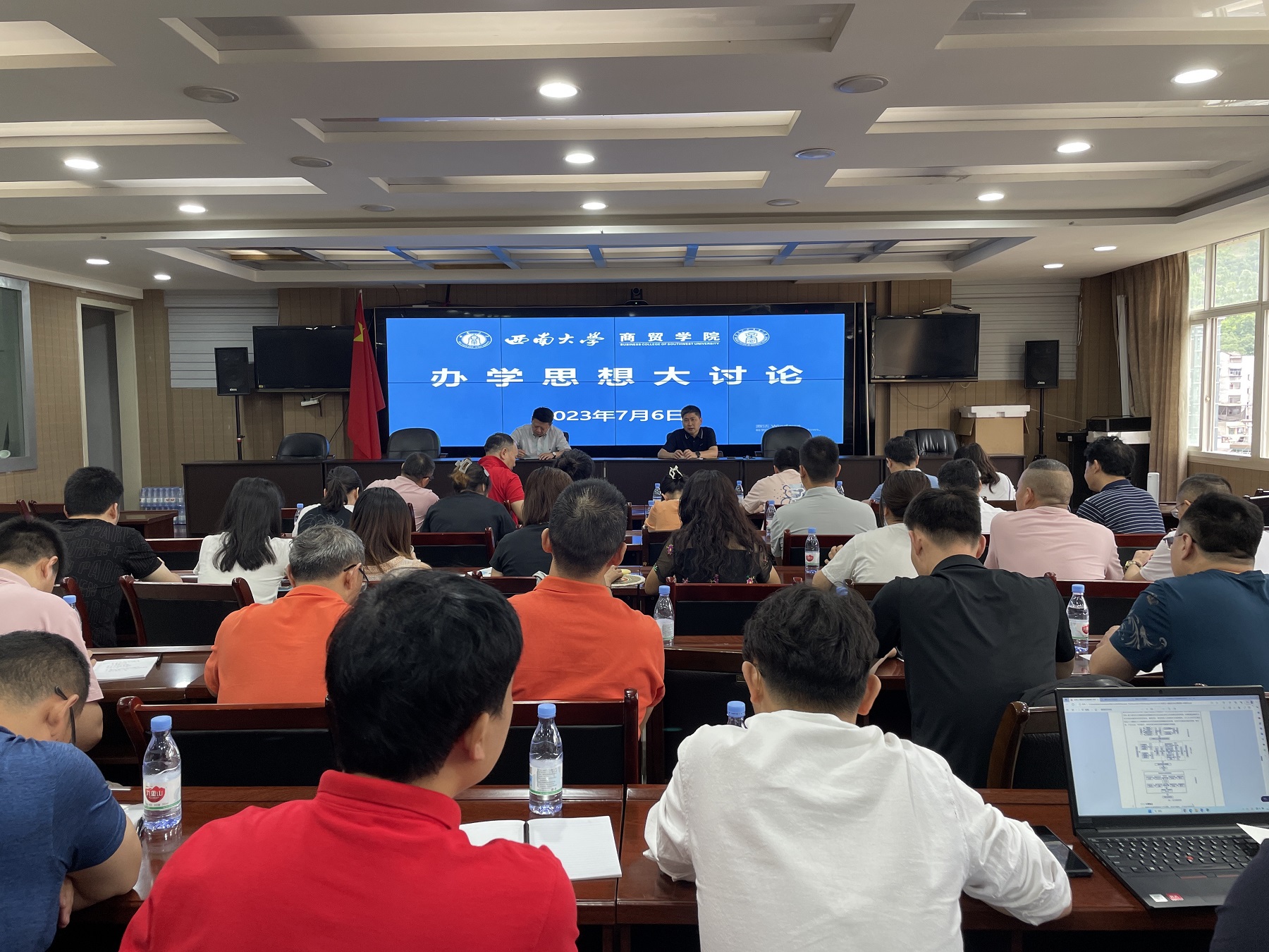 在研学和实践之余,学院以主题宣讲、分组研讨、党政联席会议的形式举行办学思想大讨论。教职工围绕学科建设和科学研究、专业建设和人才培养、人才队伍建设、课程思政建设、服务成渝双城经济圈建设、绩效分配方案修订等工作展开研讨,党政领导深入各讨论组参与交流。讨论结束后,学院立即召开党政联席会议,梳理归纳在讨论中听取的意见建议,围绕讨论成果研究出台系列切实举措,稳步推进学院事业持续向好发展。