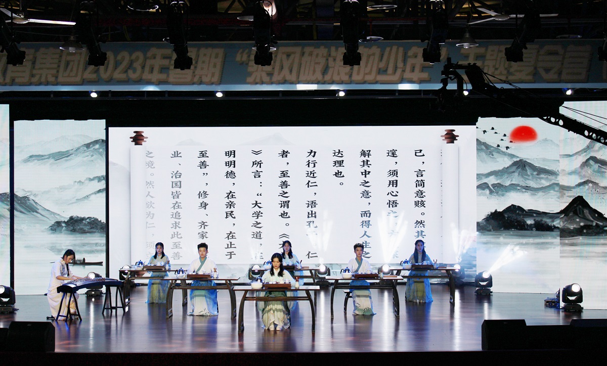 结营汇报演出按照《梦想少年》《奋进少年》《领跑少年》《强国少年》四个篇章展开,同学们将AI展示、英语配音、朗诵等研学成果融入到话剧、拉丁舞、演讲、歌舞表演等多种艺术形式中。以规范学生德行的原创文本《学训赋》,通过古筝、茶艺和朗诵三种艺术形式融合演绎,将抽象的文化内涵得以外化延伸。《把春天画在海丝路上》《请铭记雾重庆》等节目结合地方与历史印记传承奋斗精神,《强国一代有我在》《党旗飘扬的方向》气势磅礴,表达了少年们赤子之心与报国之志。