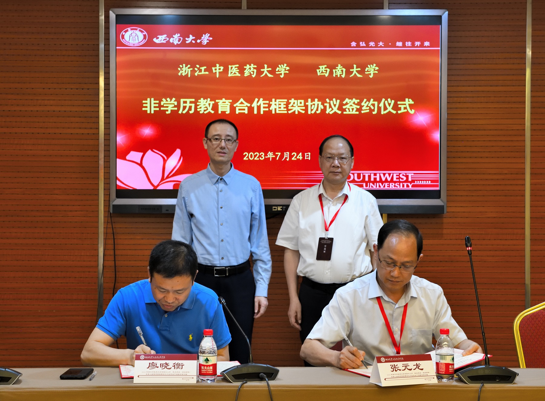 为进一步深化交流合作,提高干部、教师队伍综合素质能力,推进高等教育事业高质量发展,增强浙渝两地高校服务国家和地方经济社会建设发展,7月24日下午,浙江中医药大学与学校非学历教育合作协议在beat365英国官网举行签约仪式。浙江中医药大学党委书记黄文秀、党委副书记张元龙,学校党委副书记黄杰等领导出席此次签约仪式。党委宣传部 党委网络工作部部长,马克思主义学院党委书记廖晓衡主持开班仪式。
