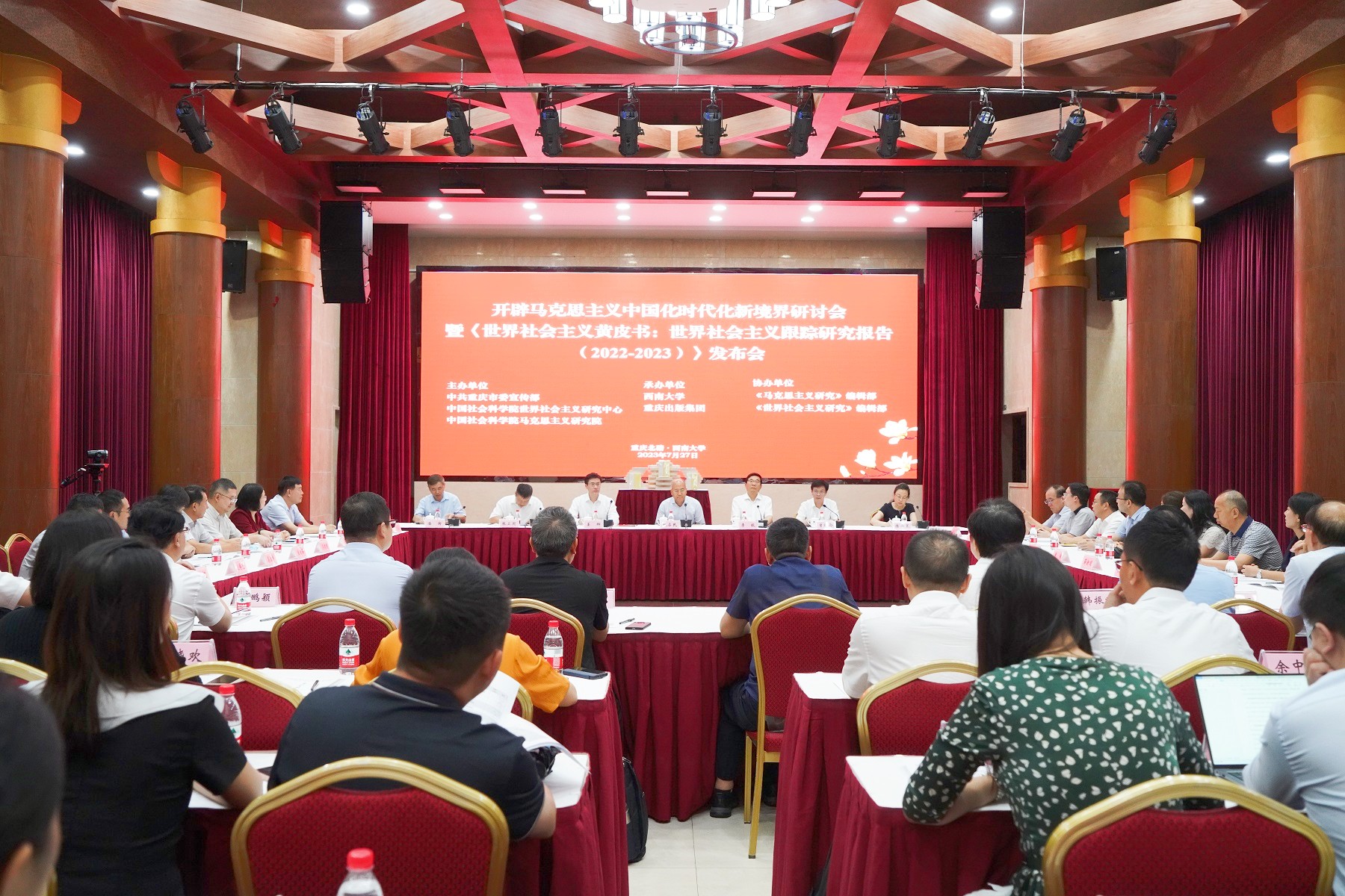 7月27日,“开辟马克思主义中国化时代化新境界”研讨会暨《世界社会主义跟踪研究报告(2022—2023)》发布会在学校召开。重庆市委常委、宣传部部长姜辉出席会议。beat365英国官网校长张卫国致欢迎辞,中国社会科学院副院长甄占民、中共中央党校副校长李毅分别现场致辞,中国社会科学院原院长王伟光视频致辞,中国社会科学院原副院长、世界社会主义研究中心主任李慎明作会议主旨报告。