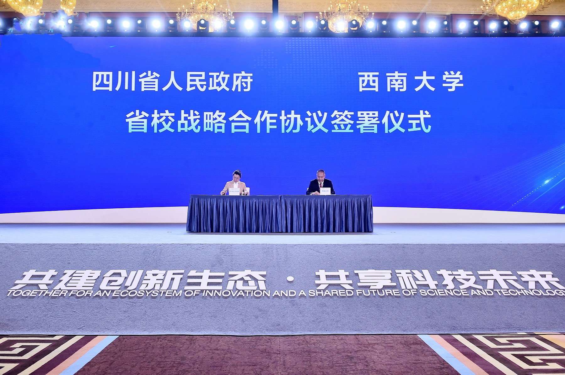 9月11日上午,四川省人民政府副省长郑备与副校长葛信勇代表省校双方签署战略合作协议。全国政协副主席、九三学社中央常务副主席邵鸿,中央统战部副部长、国务院侨办主任陈旭,四川省委书记、省人大常委会主任王晓晖,省委副书记、省长黄强,校长张卫国、校党委副书记潘洵等见证签约,四川省委常委、统战部部长、省总工会主席赵俊民主持会议。