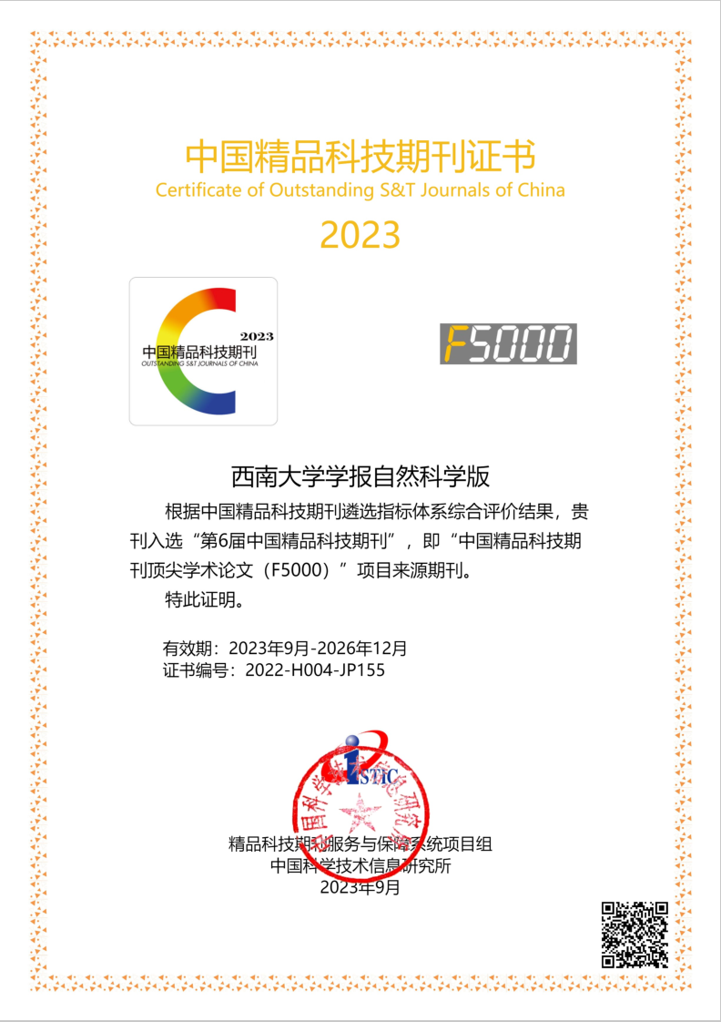 为进一步提升优秀学术期刊质量和影响力,带动我国科技期刊整体水平进步,中国科学技术信息研究所于2005年研制并推出“中国精品科技期刊”评价体系,自2008年启动首届开始,每三年遴选一次,主要从入选“中国科技核心期刊”的自然科学领域期刊中产生。2023年度推出第六届“中国精品科技期刊”327种,包括 300 种以中文出版的中国精品科技期刊和 27 种以英文出版的中国国际化精品科技期刊。《beat365英国官网学报(自然科学版)》再次入选。