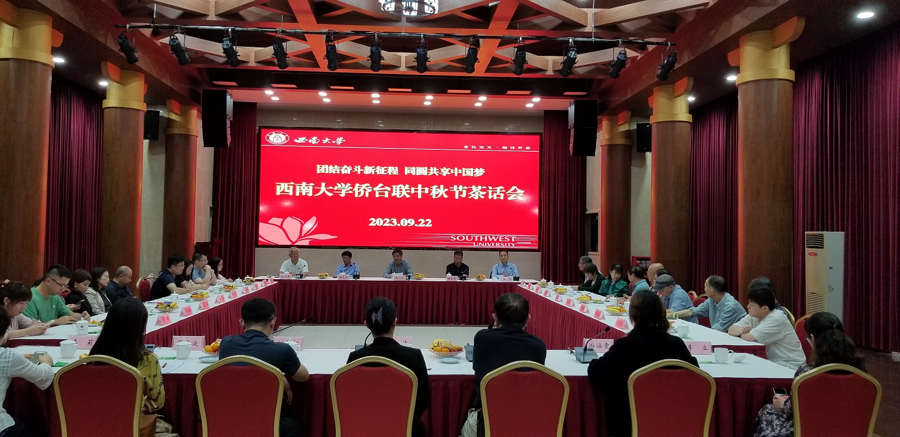 为认真贯彻落实习近平总书记关于侨务工作和群团工作的重要论述,传达学习第十一次全国归侨侨眷代表大会精神,不断凝聚侨台力量,畅叙友情,共迎佳节。在中秋节来临之际,9月22日下午,学校在东方红会议厅举行侨台联中秋节茶话会。学校党委副书记潘洵出席会议并讲话,会议由学校台联会长、图书馆馆长涂涛主持。