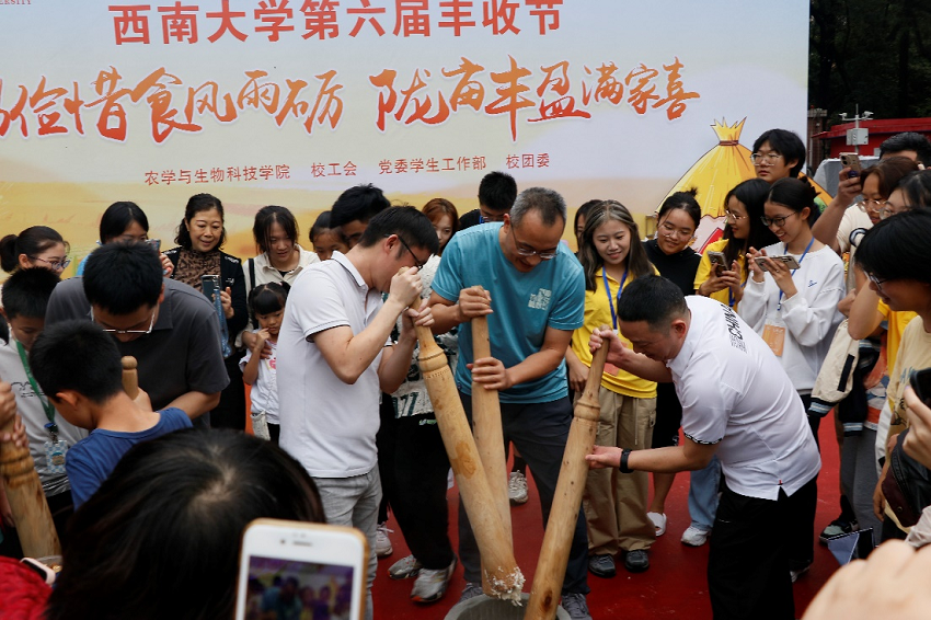 农学与生物科技学院院长吕典秋致辞,号召大家以节为媒,释放情感,传承文化,寻找归属,助力乡村振兴。活动在师生们体验传统打糍粑的热闹氛围中拉开序幕。