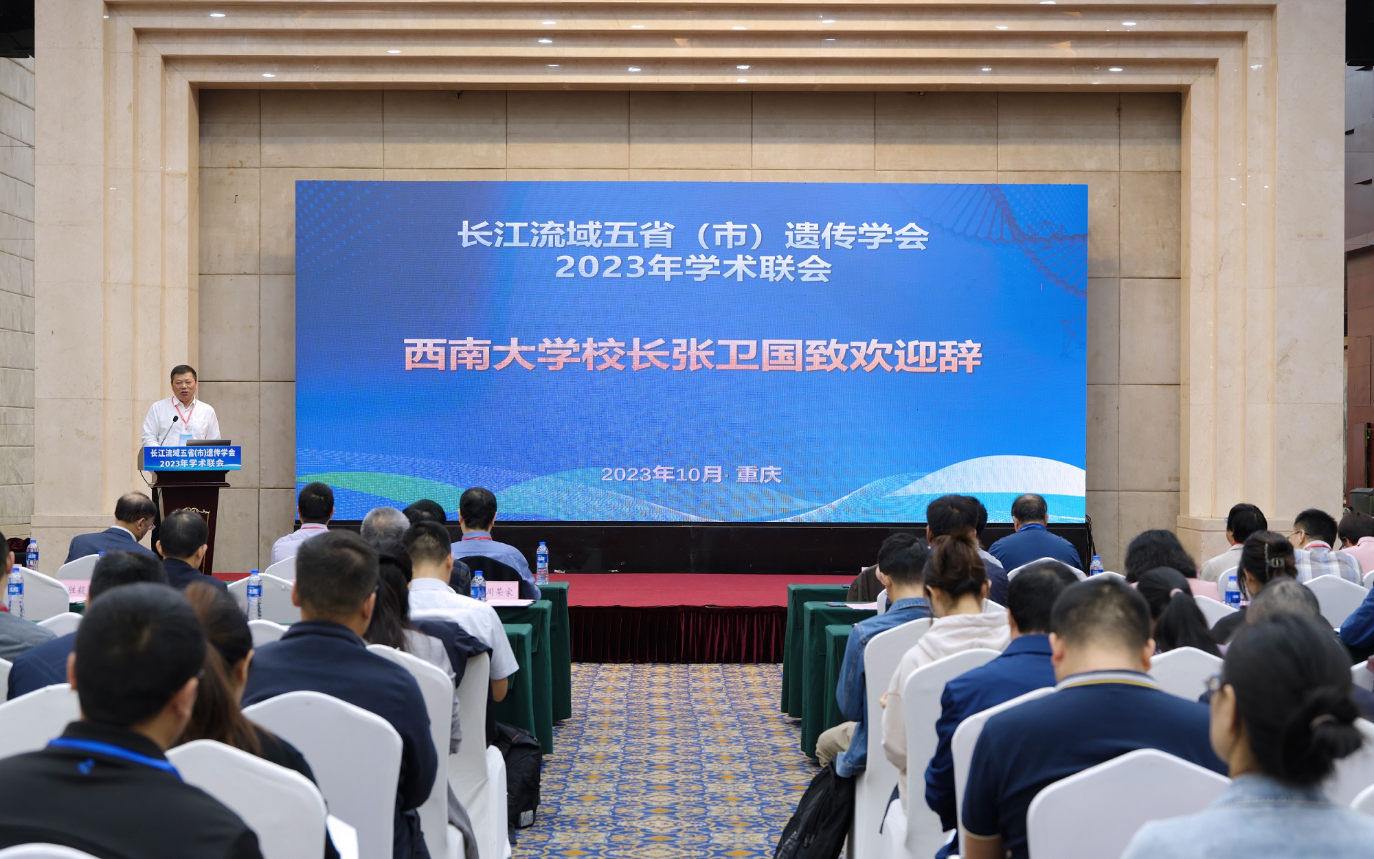 由重庆市遗传学会、安徽省遗传学会、湖北省遗传学会、湖南省遗传学会、江西省遗传学会共同主办的长江流域五省(市)遗传学会 2023 年学术联会于10月11-13日在重庆北碚召开。第十四届全国政协常委、湖南省政协副主席、南华大学校长张灼华出席开幕式。beat365英国官网校长张卫国、重庆市科协二级巡视员牛杰、中国遗传学会理事长薛勇彪先后在开幕式上致辞。来自五省(市)部分高校、科研院所、医院等单位的近300名遗传学科研教学人员和研究生参加本次会议。