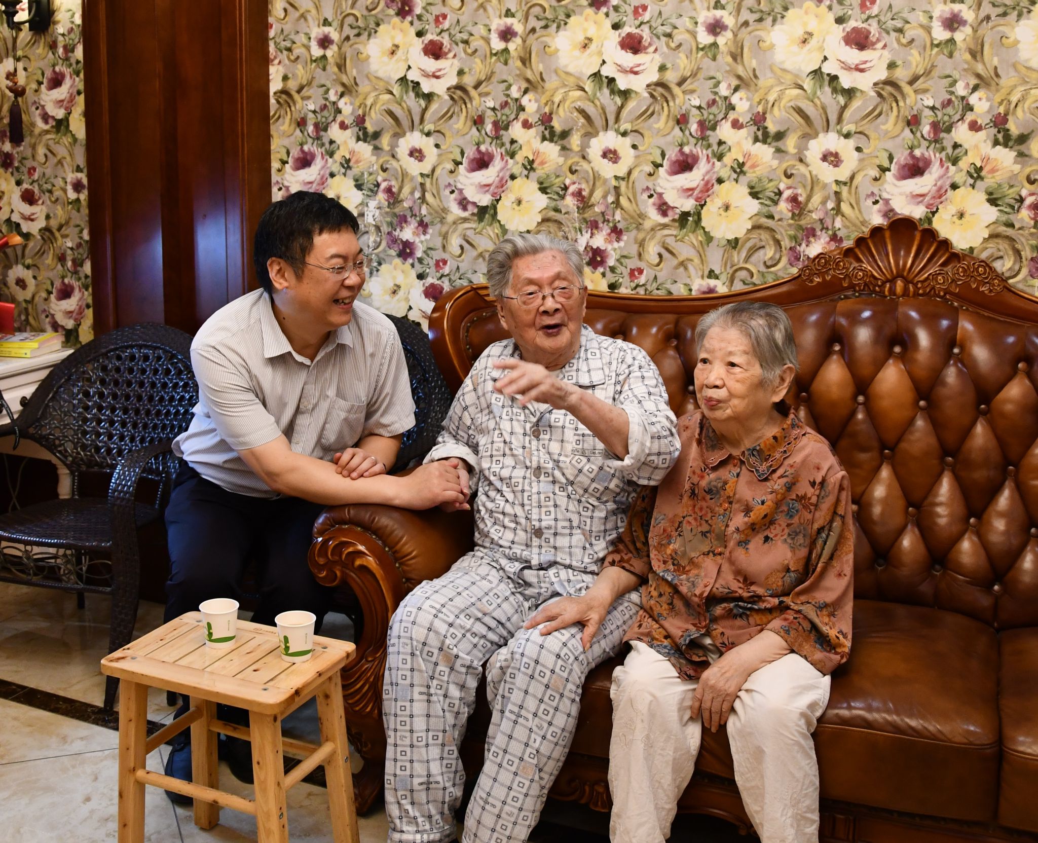 在徐炳旸家中,武好明代表学校送上鲜花等,详细询问老人身体状况和日常起居情况,感谢他为学校事业发展做出的贡献,祝福老人生活幸福、健康长寿。