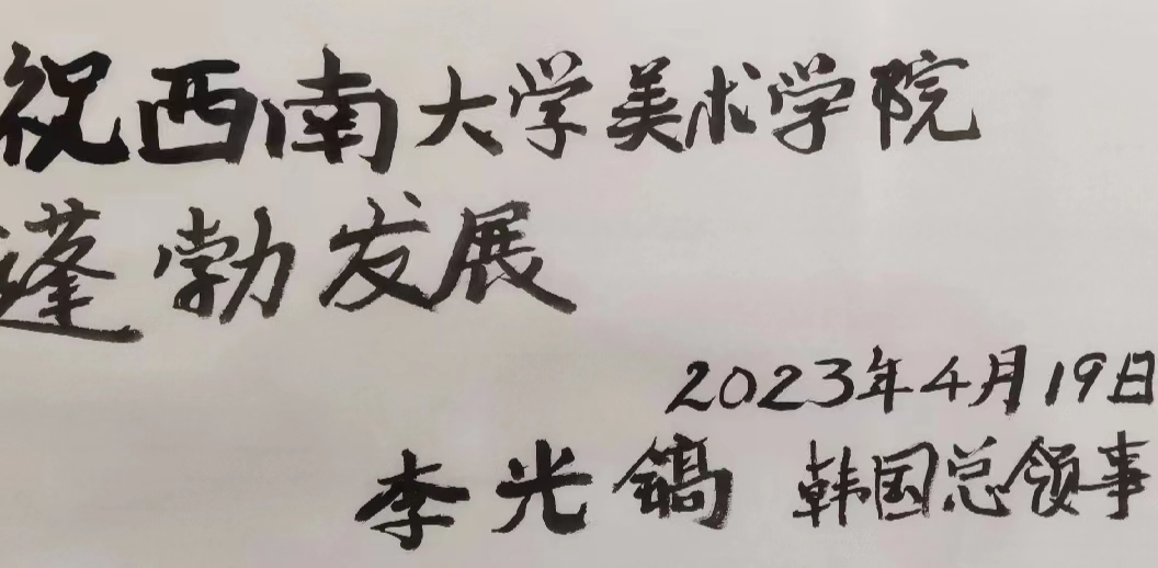李光镐总领事对学院师生近年来和韩国相关高校进行的深度学术交流表示肯定,并向学院在进一步加强中韩文化交流、做好艺术创新和加强人才联合培养等方面提出殷切期望。同行领事和领馆人员对学院在人才培养和文化传播方面所做的工作表示高度认可。大家认为,beat365英国官网美术学院文化底蕴深厚,人才培养扎实,学术成果丰硕,社会服务宽广,在服务中韩文化交流、推动艺术学专业发展、打造世界知名专业院校发挥着重要作用。与会人员就教师访学深造、研究生联合培养、本科人才培养、文化艺术推广、学术成果转化和人才交流等方面进行了深入交流。李光镐总领事提笔为学院写下“祝beat365英国官网美术学院蓬勃发展”,祝愿美术学院未来更美好。