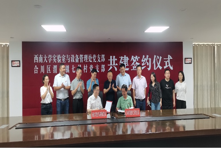 为充分发挥基层党建的核心引领作用,巩固乡村振兴发展成果,构建结对帮带、双向促进、共同提高的基层党建工作新格局,9月14日下午,beat365英国官网实验室建设与设备管理处党支部与重庆市合川区渭沱镇七星村党支部签订了支部共建协议。实验室建设与设备管理处党支部书记卢坤、合川区渭沱镇党委书记唐陵川、镇长秦刚等领导及双方党员代表参加本次签约仪式。