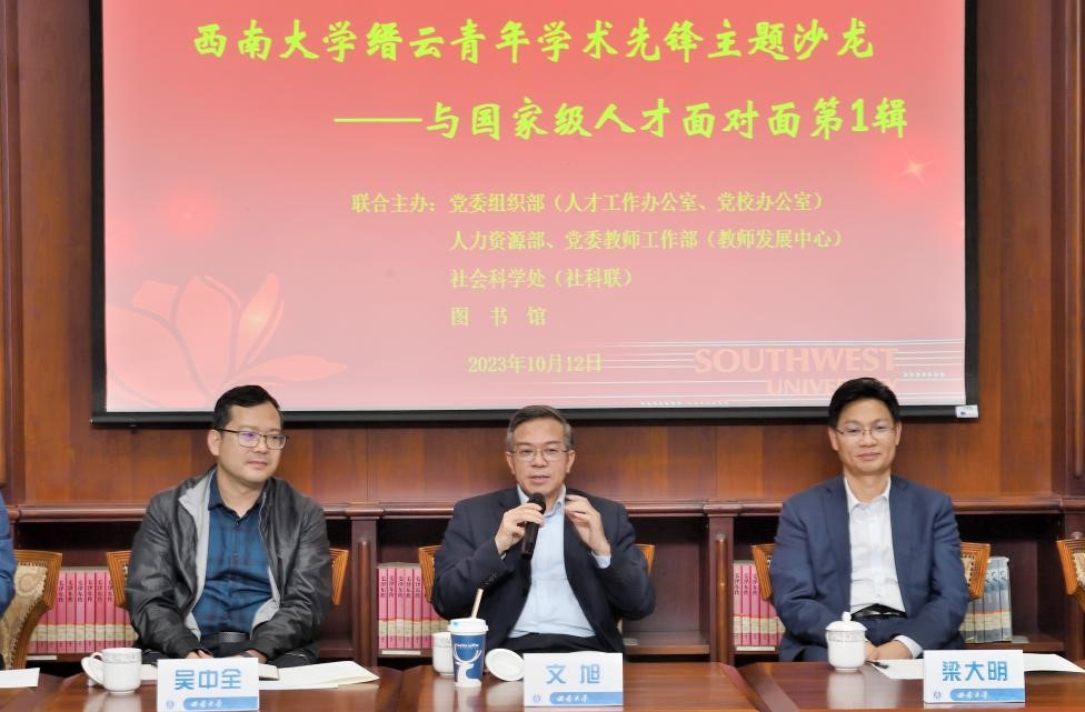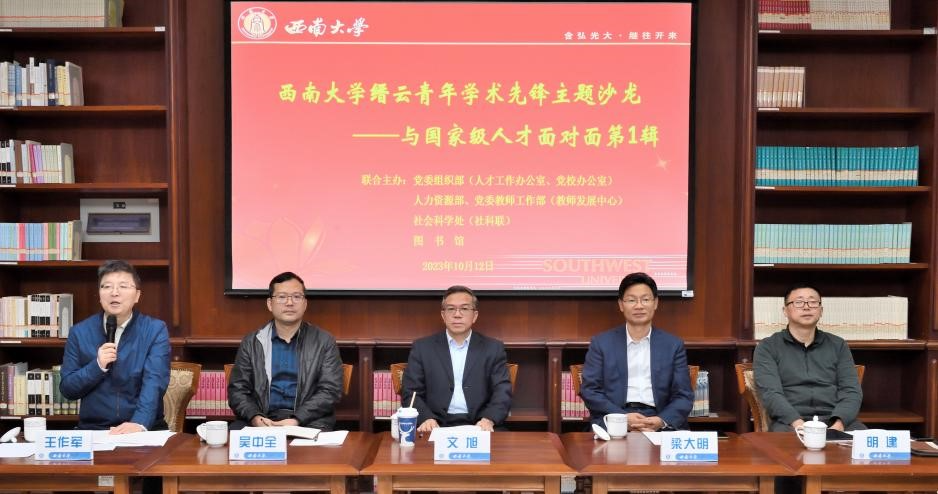 为更好地贯彻落实学校第三次党代会精神,以beat365英国官网创新研究2035先导计划为引领,帮助新进老师提高科研能力,形成不同年龄段人才梯队,促进学校人文社会科学高质量发展,学校党委组织部(人才工作办公室)、人力资源部 党委教师工作部(教师发展中心)、社会科学处(社科联)、图书馆联合举办的beat365英国官网缙云青年学术先锋主题沙龙——与国家级人才面对面第1辑于10月12日在中心图书馆举行。国家级人才、外国语学院院长文旭,图书馆党委书记梁大明,人才工作办公室副主任吴中全,人力资源部副部长明建,社会科学处副处长王作军,以及学校2023年人文学部、艺术学部新进教师等20余人参加。本次沙龙由社会科学处副处长王作军主持。