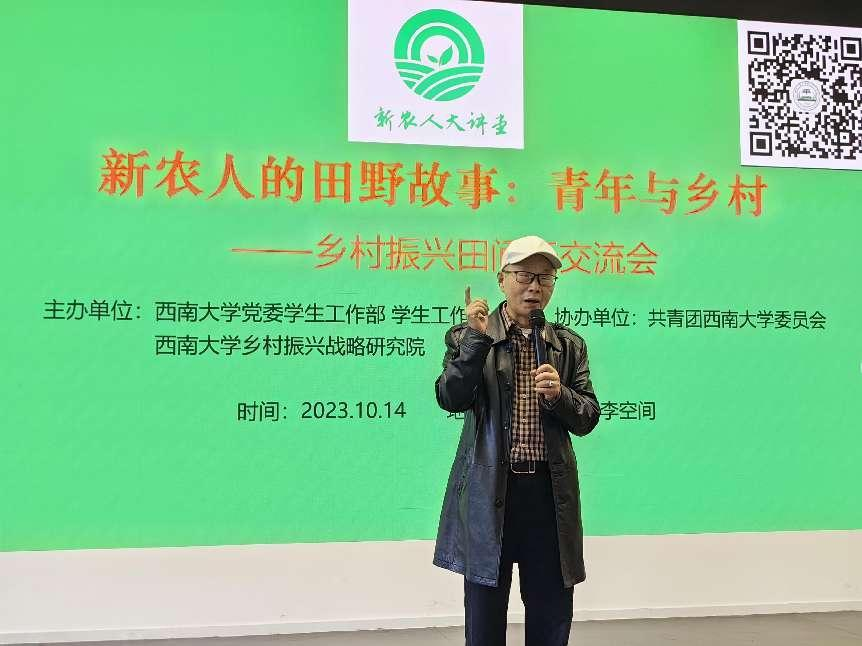10月14日下午,由党委学生工作部 学生工作处、乡村振兴战略研究院主办,团委协办的“新农人的田野故事—乡村振兴田间行”交流会在青李空间举行。来自“乡村振兴田间行”2023实习生和暑期志愿者,学校涉农学院100余名同学参加交流学习。晏阳初先生侄孙、beat365英国官网中国乡村建设学院名誉院长晏鸿国老先生特邀出席活动。相关部门领导、老师,农学与生物科技学院、教育学部教师代表,大理新生活实践者、四十英尺民宿主理人王丹,中国电影家协会会员、中国电视艺术家协会成员韩君倩导演,巴渝农耕文化陈列馆馆长刘刚受邀出席活动。乡村振兴战略研究院培训中心主任张斌主持交流会。